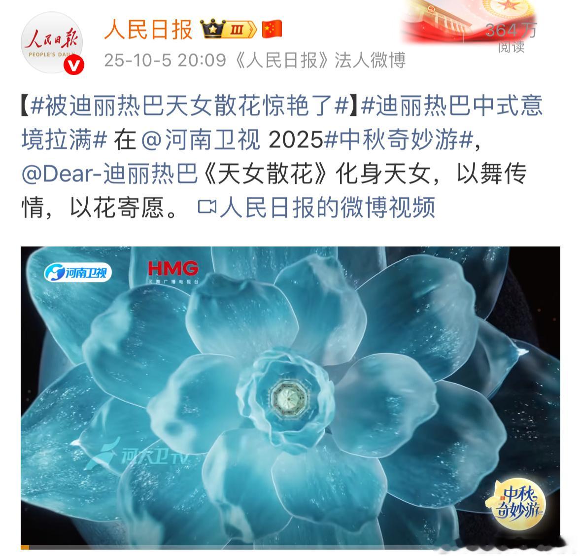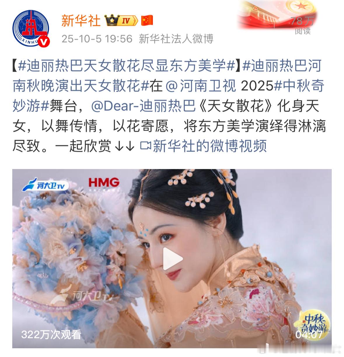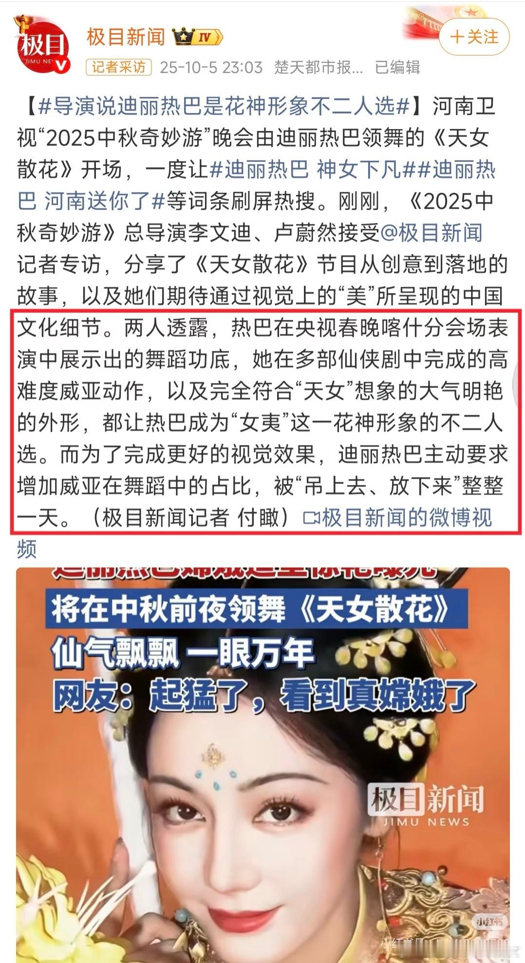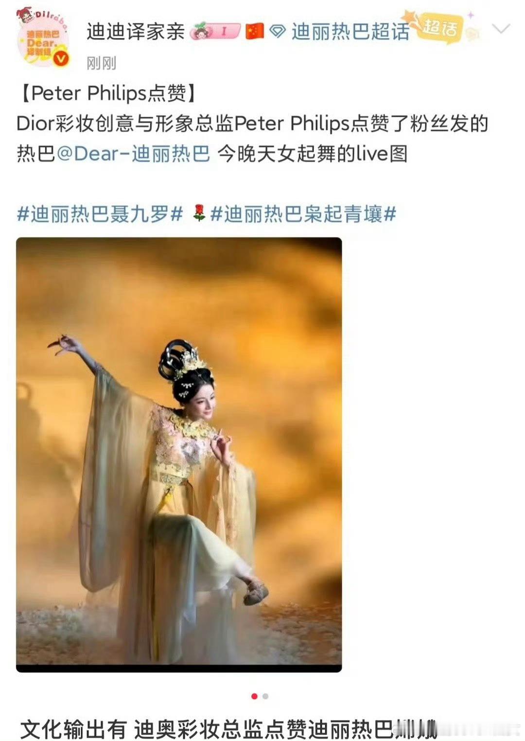 迪丽热巴中秋晚会身穿3种非遗演绎天女,被新 华 社等主流官媒夸赞,非常出圈,中秋晚会造型被迪奥创意总监点赞。《中秋奇妙游》导演评价迪丽热巴是花神形象不二人选。连着有效活动,文化输出🈶迪奥明珠🈶海内外大出圈🈶,这个迪丽热巴太牛了吧