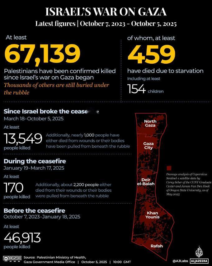 半岛电视台:截止10月5日,以色列杀害67139巴勒斯坦人。