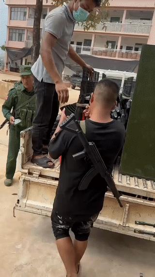 竟然还有中国生产的“九五”式突击步枪? 而那名黑衣男子身上背的枪看起来也是特别熟悉,忘了叫什么枪了? #突击步枪# #果敢老兵# #九五式自动步枪#