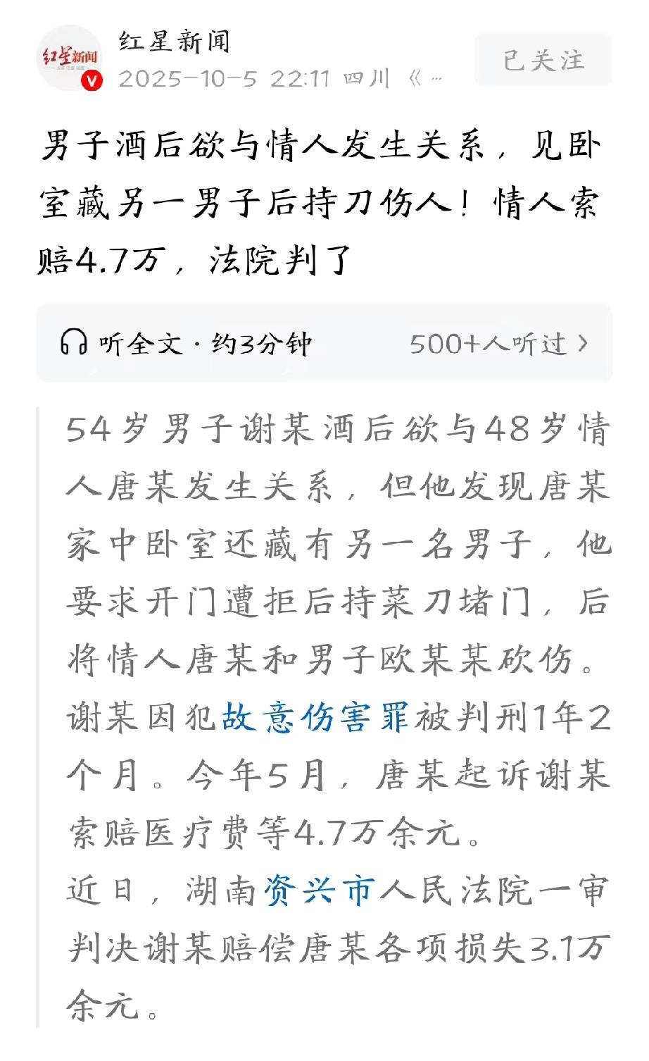 湖南资兴,51岁男子喝完酒后心痒难耐,想找老相好亲热一番,谁知电话里突然听见对方屋里有男人,便火急火燎赶到女子家里,女子遮遮掩掩,男子更加确定卧室里藏了人。他怒火中烧,跑到厨房拿了把菜刀,守到门口死等,女子怕出事,打电话搬来救兵。谁知,男子急了,挥起菜刀砍伤了女子和屋里的那个男人。女子住院14天后,越想越气,将男子告上法庭,索赔4.7万。 51岁的谢某一把年纪,但依然风流,有个48岁的老相好唐某。 2024年2月26日晚上8点多,谢某喝了不少酒,心里痒痒的不行,想跟唐某亲热亲热,就给她打了个电话。 结果电话一接通,他听到那边有个男人的声音,马上察觉到不对劲,决定去唐某家看看。 晚上9点来钟,谢某晃晃悠悠地走到唐某家,进门后,唐某遮遮掩掩,支支吾吾,他断定,卧室里肯定藏人了。 他让唐某马上开门,唐某死活不肯,两人你一言我一语就吵起来了。 谢某怒火中烧,我在你身上花了那么多钱,你竟然背着我在外面养人,这口气他咽不下。 谢某一直等,直到27日凌晨1点,躲在卧室里的男子欧某就是不出来。 谢某越想越憋屈,他一气之下,用凳子把唐某家的大门给堵上了,又跑到厨房拿了把菜刀,举着刀威胁唐某,让她马上开门。 唐某不开,他骂骂咧咧的坐下来,边喝酒边等欧某出来,非得把他等出来不可。 凌晨4点,唐某实在没办法了,给堂哥樊某打了电话求救。 过了大概半小时,樊某和老婆段某赶到唐某家,唐某一看救兵来了,也顾不上谢某手里的菜刀,上去就要开门。 谢某一看急了,举着菜刀就朝唐某砍了过去,唐某躲闪不及,右手和右侧头面部都被砍伤了,疼得直叫唤。 欧某在卧室里听到唐某的呼救声,知道再不出来事儿就大了,赶紧打开房门。结果刚一露头,也被谢某的菜刀砍中了头面部,鲜血直流。 不过欧某某也不是吃素的,一把就把谢某给放倒在地上。 樊某见状也冲了进来,一把夺过谢某手里的菜刀,和欧某、唐某一起将谢某制服,段某也赶紧掏出手机报了警。 凌晨5点,唐某被紧急送往医院,经检查,唐某开放性右拇指指骨骨折、手部指伸肌腱损伤、手浅表损伤、开放性颅骨骨折、头皮裂伤,面部损伤也有。 唐某躺在病床上,疼的龇牙咧嘴,后悔莫及,早知道就不跟谢某搅和在一起了。 随后,谢某以涉嫌故意伤害被刑事拘留。 根据《刑法》第234条规定:故意伤害他人身体的,处三年以下有期徒刑、拘役或者管制 。 谢某持菜刀砍伤唐某和欧某,导致唐某开放性右拇指指骨骨折、手部指伸肌腱损伤、开放性颅骨骨折等多处伤情,其行为符合故意伤害罪的构成要件。 6月17日,法院以故意伤害罪,判处谢某有期徒刑一年零两个月。 事后,唐某找专业机构做了司法鉴定所,计算了误工、护理、营养费等。 鉴定结果显示,唐某因此事休养三个月,请人护理一个月,加强营养一个月,这些七七八八的算下来,是一笔不小的费用。 自己已经受了疼,钱不能也让自己掏,于是,唐某将谢某告上法庭,让他赔偿医疗费、误工费、营养费等4.7万元。 法院审理认为,谢某持菜刀砍伤唐某右手部、右侧头面部,致其开放性右拇指指骨骨折,手部伸肌腱损伤,开放性颅骨骨折,头皮裂创。 根据《民法典》第1179条规定:侵害他人造成人身损害的,应当赔偿医疗费、护理费、交通费、营养费、住院伙食补助费等为治疗和康复支出的合理费用,以及因误工减少的收入 。 谢某的伤害行为给唐某造成了身体损伤,唐某因此产生了医疗费、误工费、护理费、营养费等损失,谢某应当承担相应的赔偿责任。 法院根据唐某的实际损失情况,认定共计3.1万余元。 最终,法院判决谢某赔偿唐某各项损失3.1万余元。
