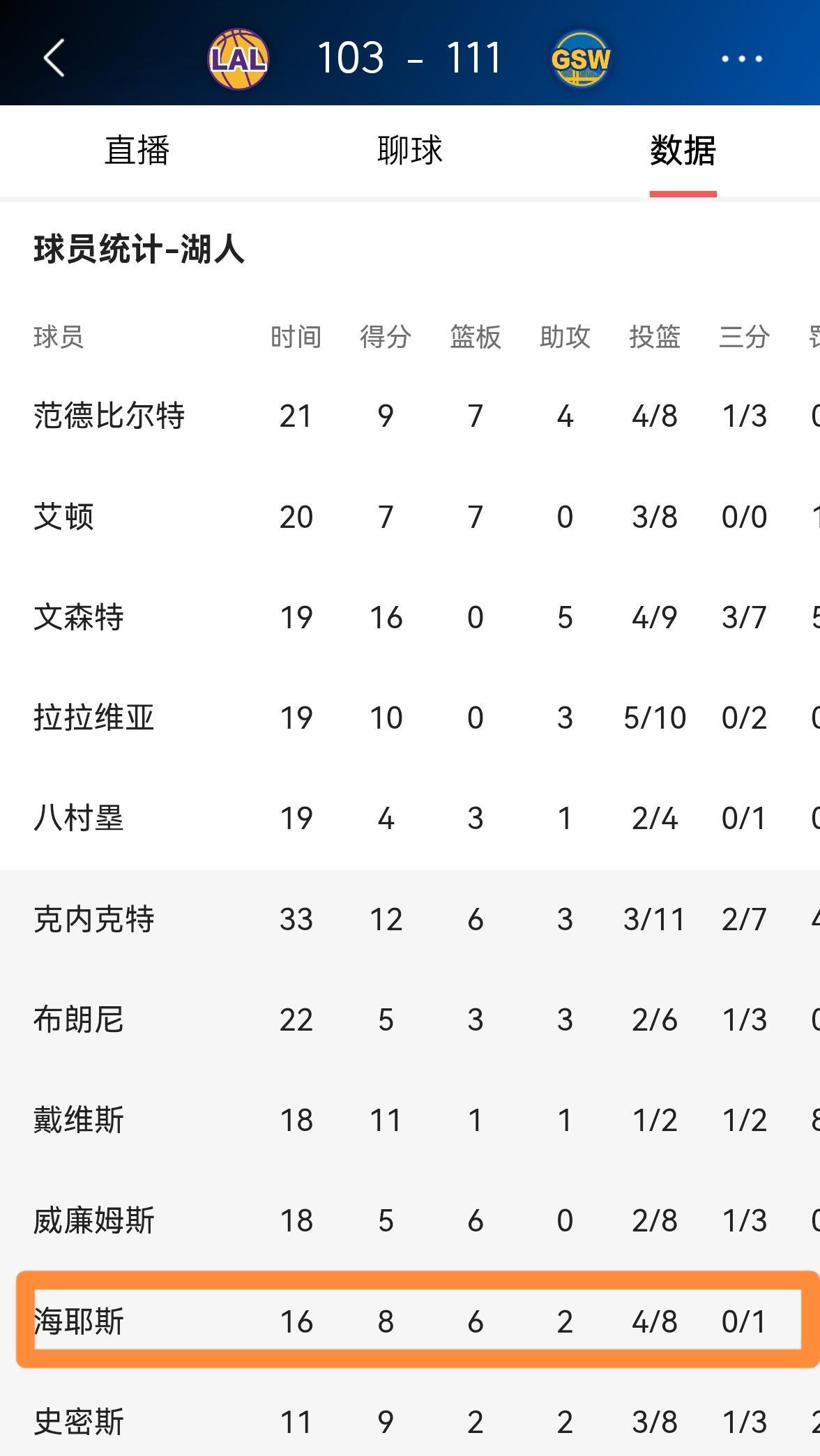 我强烈建议湖人主帅雷迪克用海斯取代艾顿的首发位置!在今天湖人以103:111输给
