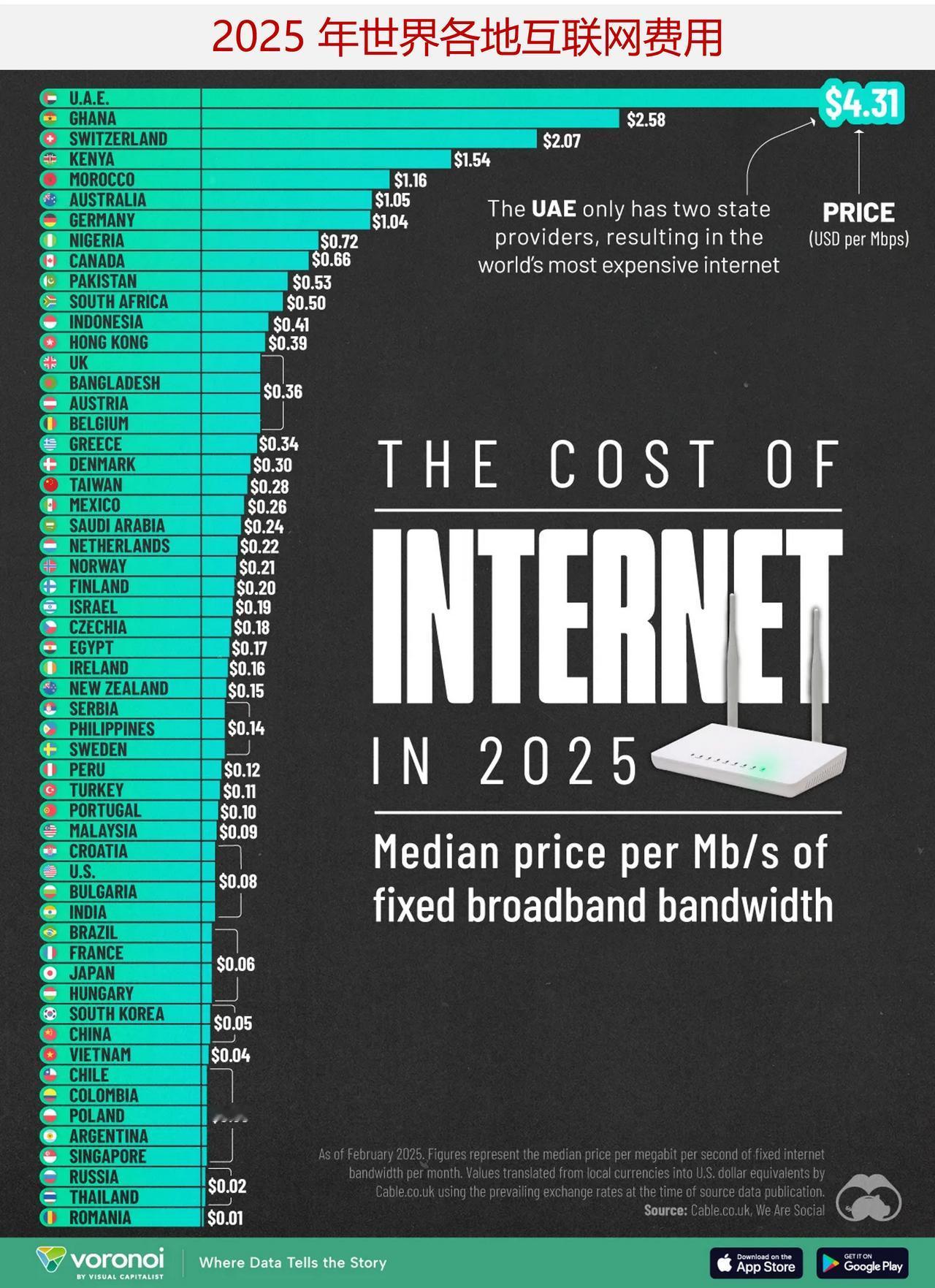 图说2025 年世界各地互联网费用情况,哪里的互联网费用高,哪里的互联网费用低? 在这个互联互通程度前所未有的世界里,互联网接入已成为不可或缺的基础设施。然而,世界各地人们为此付出的代价却相差甚远。 这张图表展示了 2025 年全球 60 多个国家/地区每兆比特每秒(Mbps)固定宽带互联网的费用情况。该图表中的数据来源于“ We Are Social”。 ——最昂贵的网络:海湾国家与撒哈拉以南非洲地区 在排名中位居榜首的是阿拉伯联合酋长国,其每兆比特每秒的平均费用为 4.31 美元——几乎是排名第二的加纳(2.58 美元)的两倍。 这些高昂的价格通常是由竞争不足、基础设施问题以及监管因素造成的。瑞士、肯尼亚和摩洛哥在该榜单上也名列前茅,每兆比特每秒的价格均超过 1 美元。 ——欧洲和亚洲的廉价互联网服务 与此形成鲜明对比的是,像罗马尼亚(每兆比特每秒0.01 美元)、俄罗斯(0.02 美元)和波兰(0.03 美元)这样的国家提供了世界上一些最便宜的宽带服务。 东欧在网络资费方面一直表现突出,这可能得益于激烈的市场竞争以及政府在数字基础设施方面的大量投入。亚洲国家如越南、中国和韩国也能够以低廉的价格提供高速网络服务,有些地区的每兆比特每秒费用低至 0.05 美元。 ——美国处于何种地位? 美国属于较为经济实惠的国家之列,其互联网费用为每兆比特每秒 0.08 美元。其他西方国家如法国、日本和德国的互联网费用也低于全球平均水平(约为每兆比特每秒 0.42 美元)。