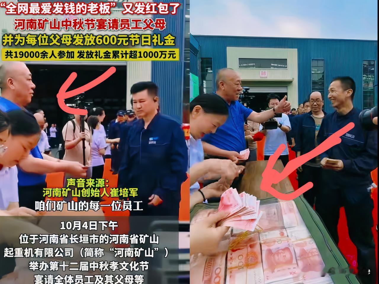 “这下好了,全国人民都知道了!”河南最爱发钱老板又出名了,中秋节给每位员工父母发600。结果没想到现场还讲了个故事,有一个员工买房差15万想预支工资,老板直接给了20万,让他买房结婚。 崔培军老说员工就像自己孩子,只要孩子开口,合情合理的需求他都支持。这样的老板,在他的企业上班,员工怎么会不卖力。这老板看似在花钱,实则是在收获人心,是精明的“感情投资”。 要是你遇上这样的老板,什么感受?