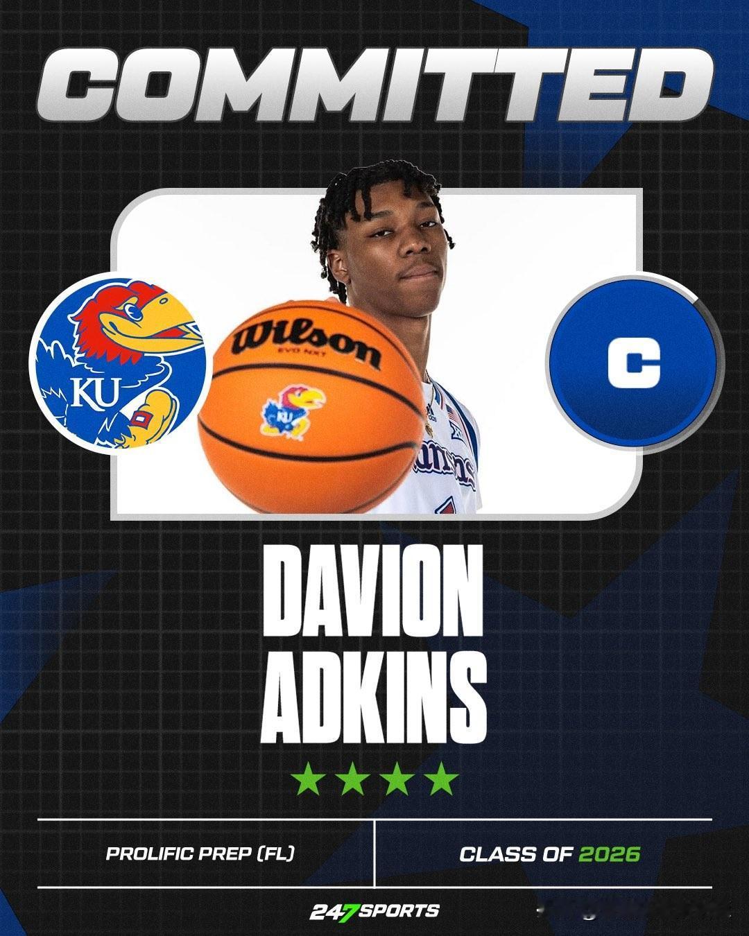 TOP50四星内线Davion Adkins宣布承诺NCAA男篮 堪萨斯大学,来自德州达拉斯,高四赛季转学至佛罗里达州Prolific Prep,身高6-9=206,球队近期收到的第四位加盟者,之前还有五星控卫Tay Kinney与四星小前锋Trent Perry,2027届招生 五星侧翼Javon Bardwell。