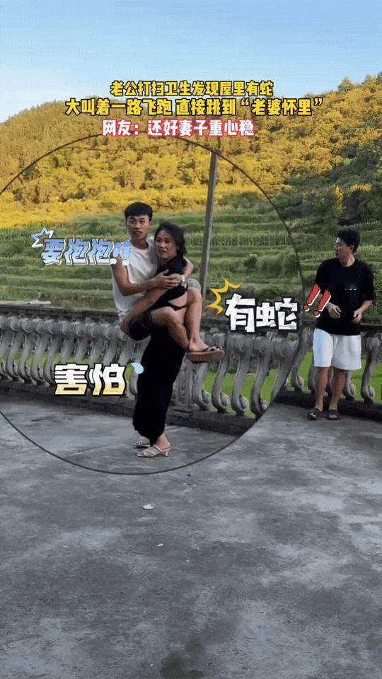笑不活了!老公打扫卫生时发现家里有蛇,吓得大叫一路狂奔到院子里,直接跳到老婆怀里。老婆虽然也被老公吓了一大跳,但还是稳稳的抱住了老公,一旁的男子看到这一幕,一脸的无语表情! 老公撞见蛇时的尖叫与狂奔,哪里是狼狈,更像卸下所有硬壳的孩子气——他奔向老婆的模样那样自然,想必早把她的怀抱当成了最安心的避风港。 老婆被惊到的瞬间没松手,反而稳稳托住他,这份“有力气”哪是天生,分明是无数次日常里,悄悄为爱人攒下的底气。 一旁大哥的“没眼看”,倒成了这段小插曲的可爱注脚。原来最好的感情从不是谁强谁弱,而是你敢在我面前露怯,我愿为你撑起底气,在旁人不懂的小慌乱里,藏着独一份的踏实与甜。