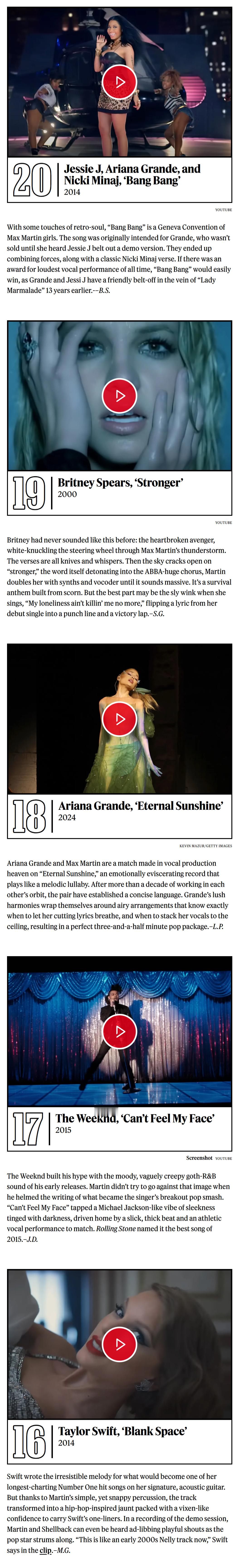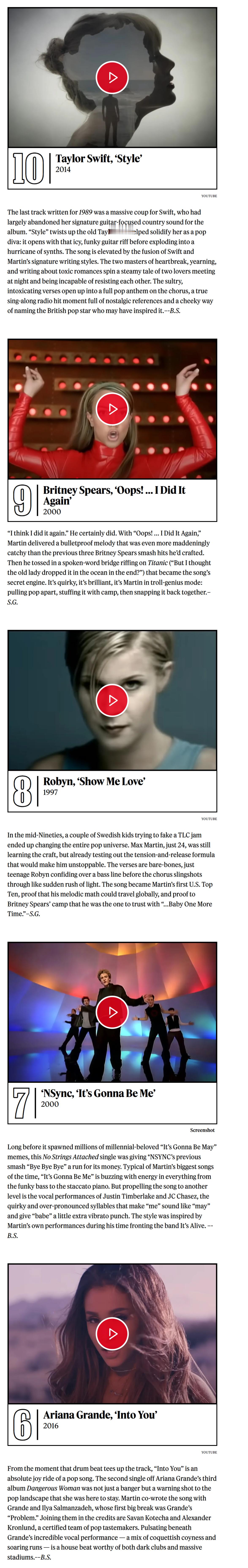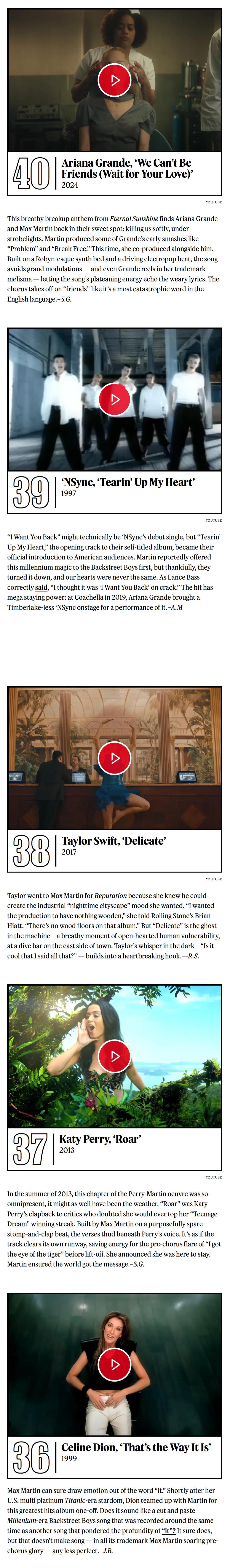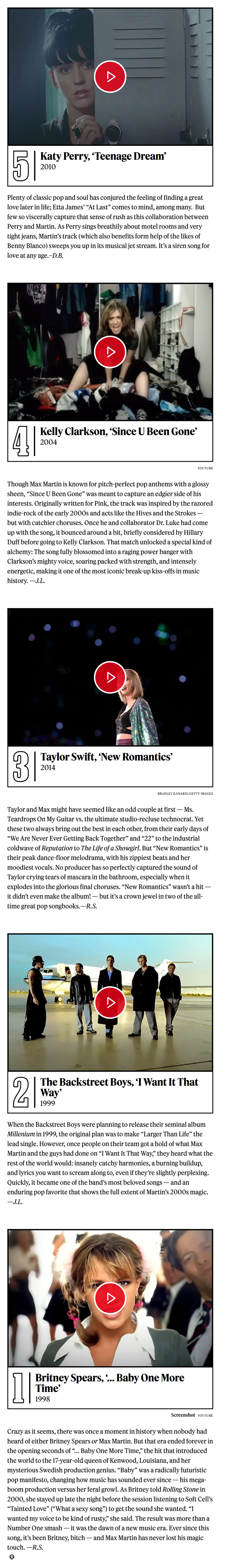 《滚石》杂志评选Max Martin打造的50首最佳金曲!小甜甜布兰妮出道神曲…Baby One More Time无悬念夺冠!而后街男孩最伟大神曲I Want It That Way获得亚军!这两首真就是他的巅峰制作!是影响至今、足以载入史册的大神曲!令人惊喜的是Kelly Clarkson转型爆单Since U Been Gone排名第4!水果姐Katy Perry最佳神曲Teenage Dream《春梦》高居第5![亲亲][爱你][憧憬][哇][舔屏]