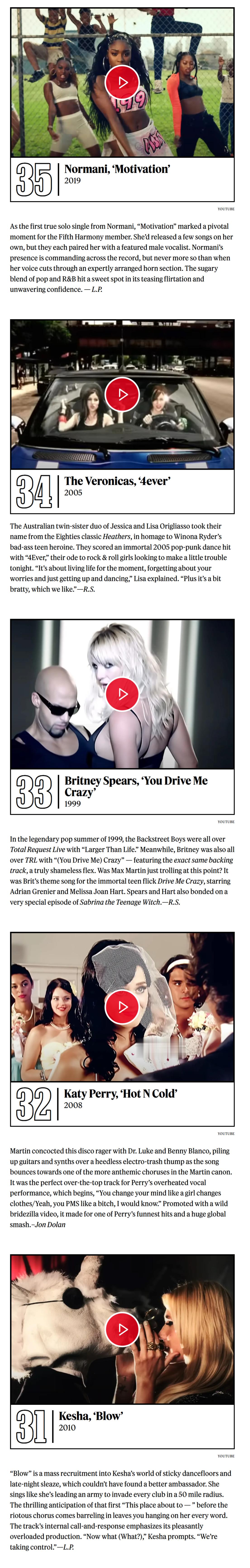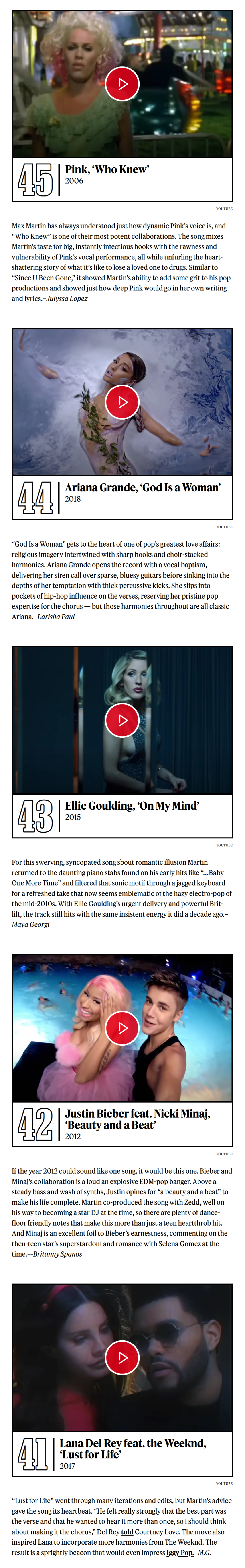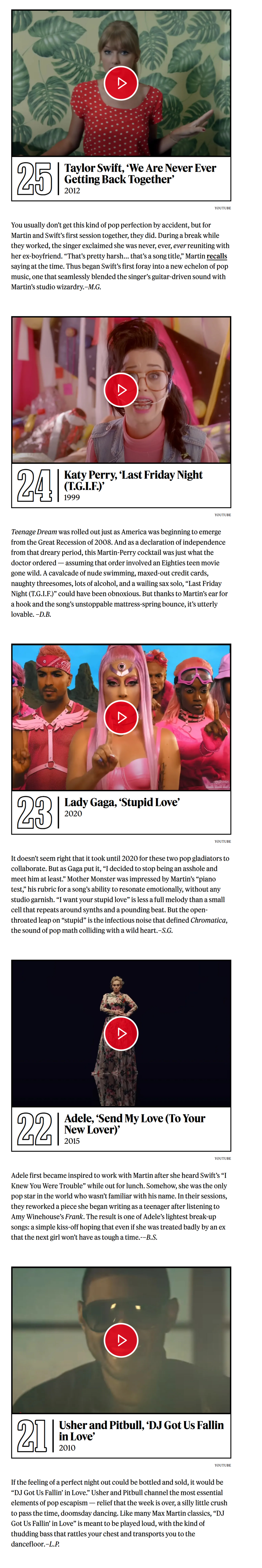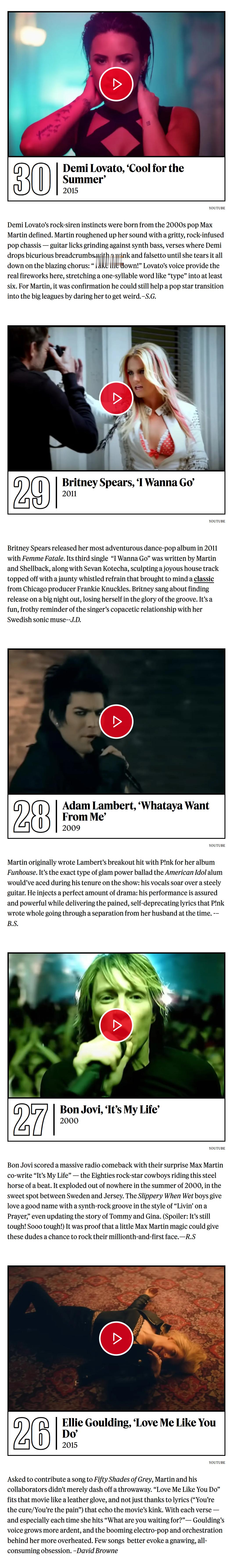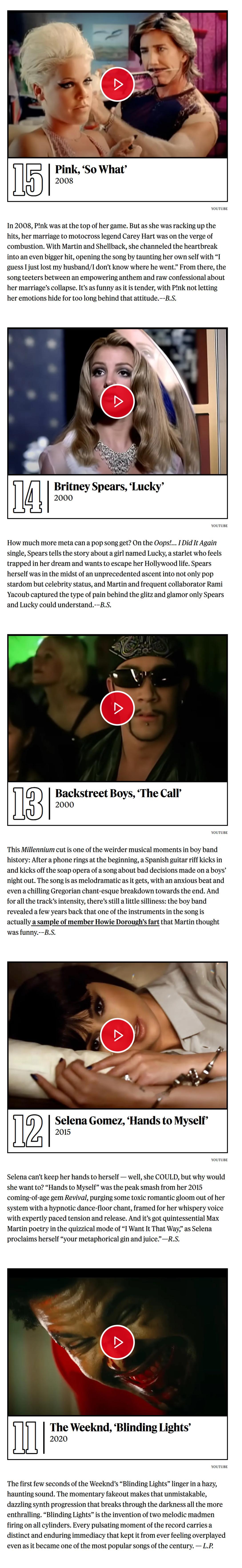 《滚石》杂志评选Max Martin打造的50首最佳金曲!小甜甜布兰妮出道神曲…Baby One More Time无悬念夺冠!而后街男孩最伟大神曲I Want It That Way获得亚军!这两首真就是他的巅峰制作!是影响至今、足以载入史册的大神曲!令人惊喜的是Kelly Clarkson转型爆单Since U Been Gone排名第4!水果姐Katy Perry最佳神曲Teenage Dream《春梦》高居第5![亲亲][爱你][憧憬][哇][舔屏]