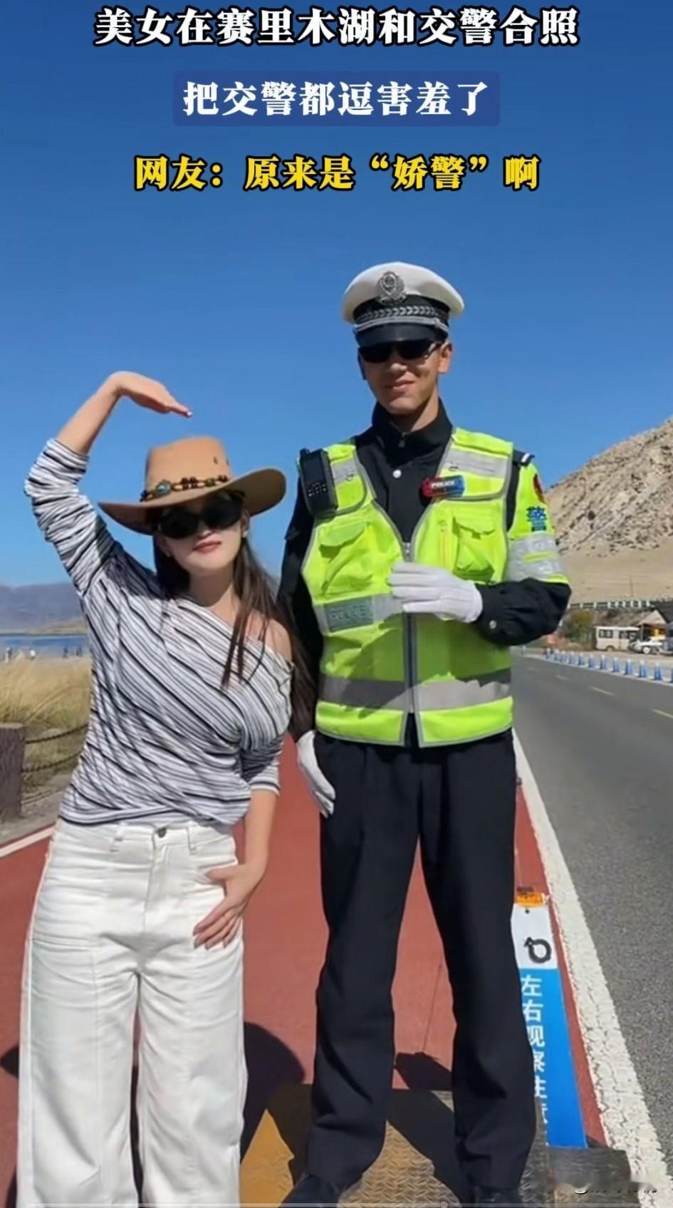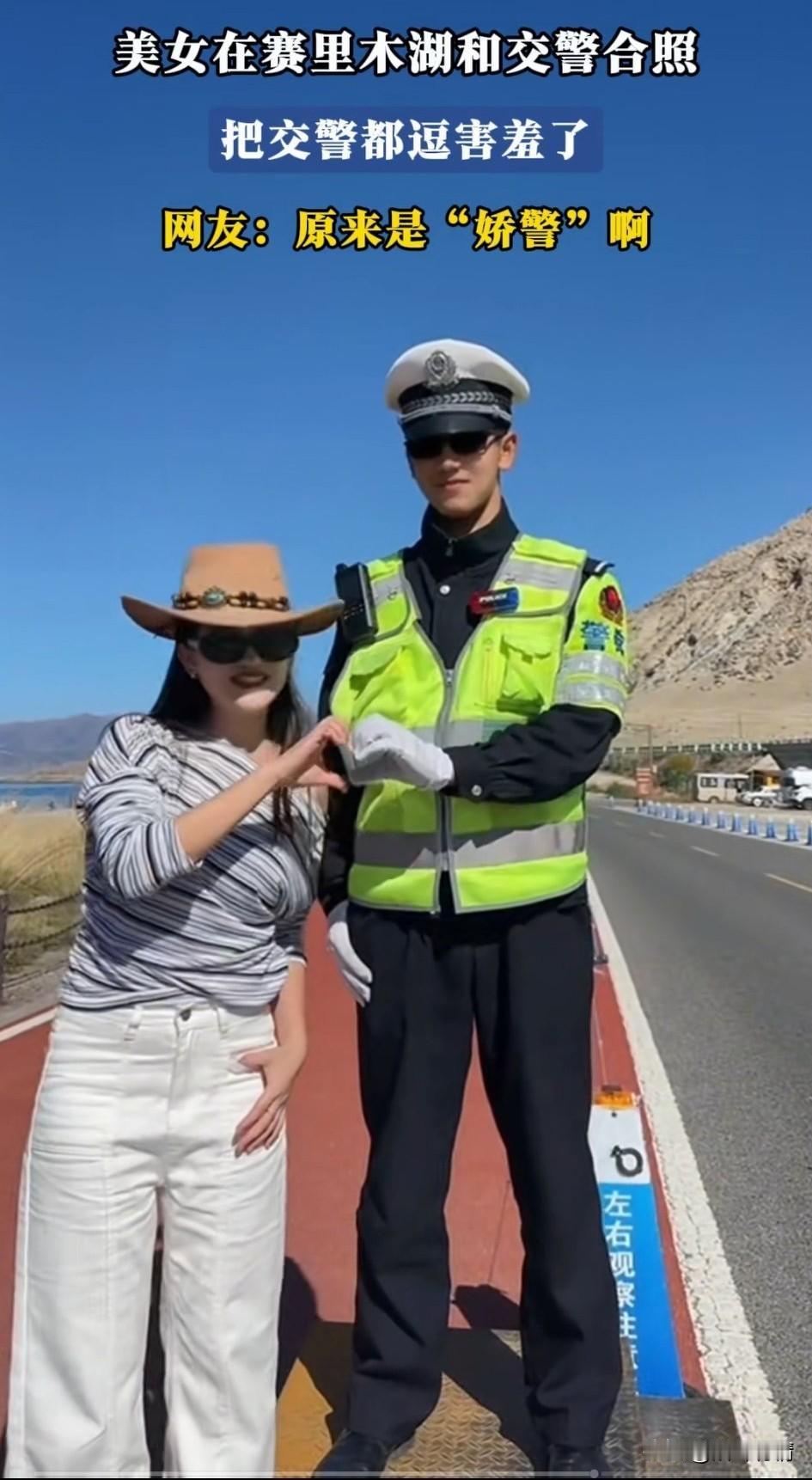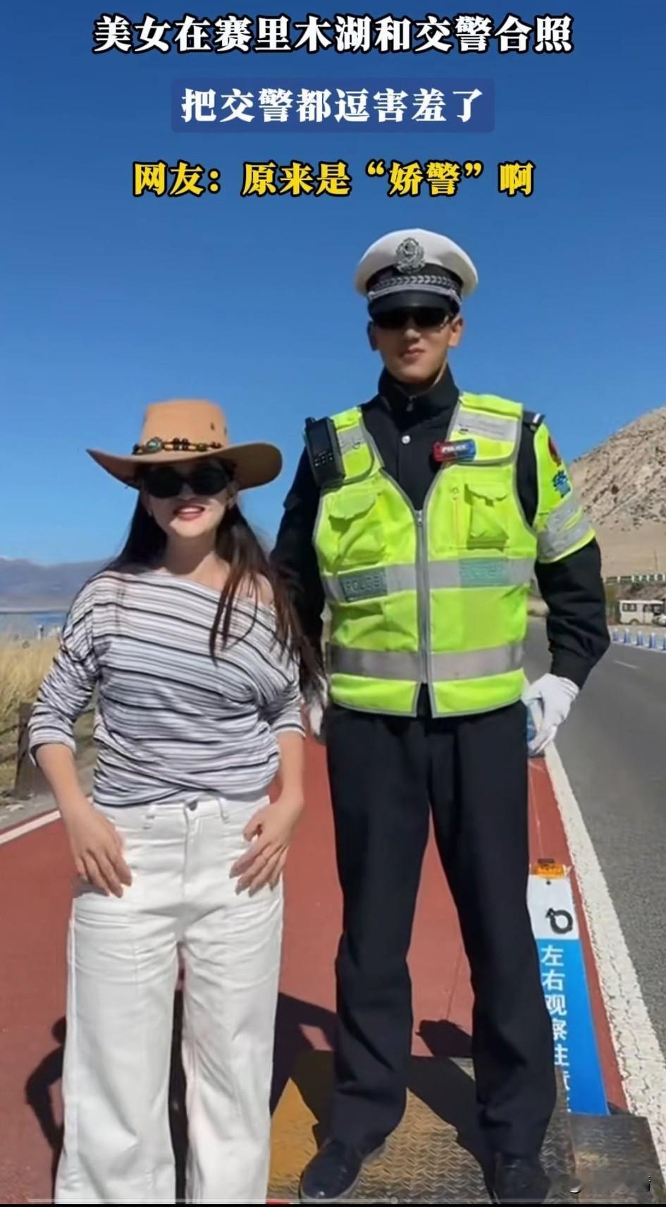 女子在赛里木湖遇到帅哥交警, 非要占人家旁边要合影, 把交警给整害羞了, 最后为了给游客一个美好的旅程, 转过身与女游客开心合影 女生看着帅哥笑开了花, 谁说帅不能当饭吃, 女孩子面对帅哥还是没有抵抗力的, 女子将手路过帽子想要做个爱心, 帅交警将手放在胸前比爱心, 两个人都比较激动, 不在一个频道, 女子意识到后, 赶紧把手放下来, 两人比了一个爱心, 网友表示原来是是娇警呀! 赛里木湖 湖赛里木湖 赛里木湖环线 塞里木湖旅游