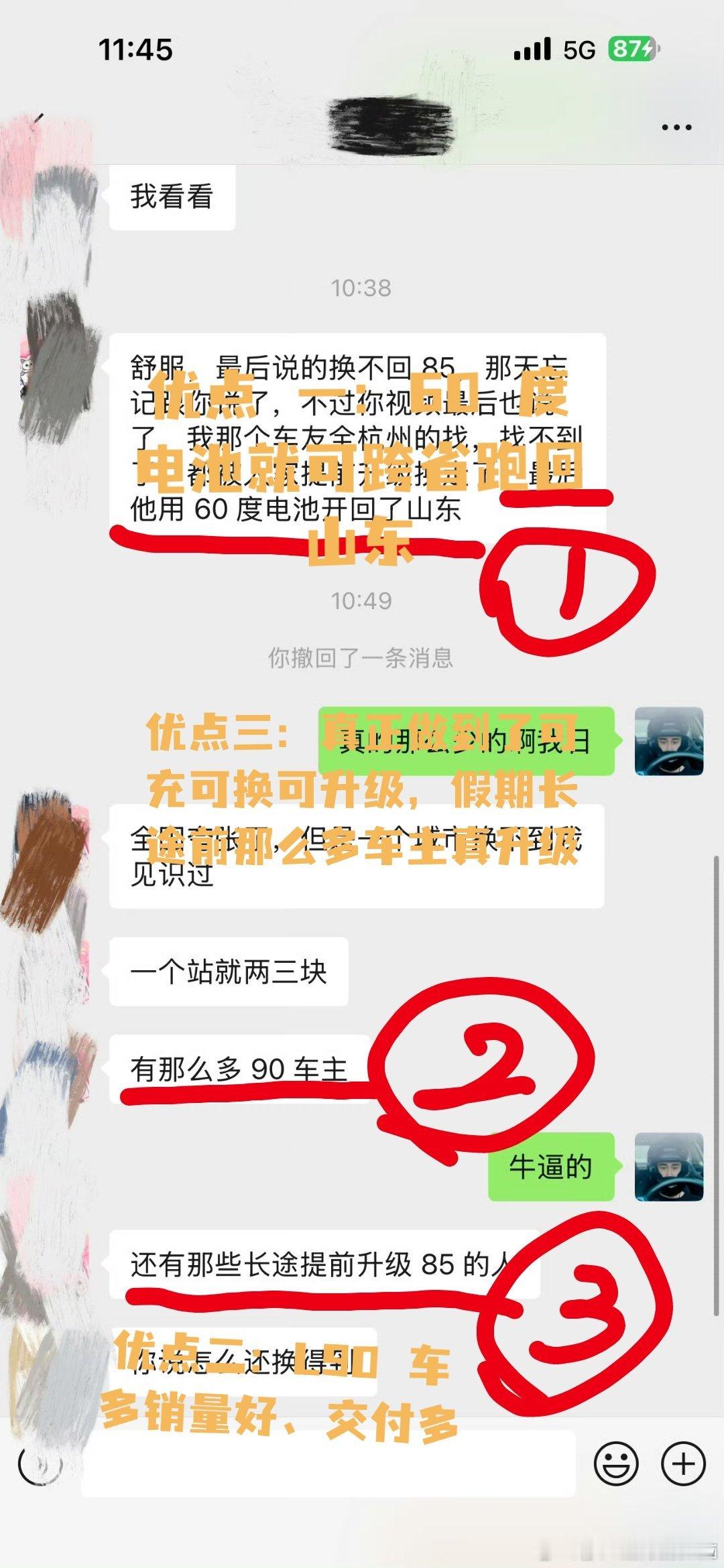 那既然:60 度的电池就可以从某地(我具体不知道出发地是哪里)还回山东「此处为优点一」;有那么多 90 车主「此处为有点 2,因为 90 标配 85 度电池➕图中提到 90 车多」;那些长途提前升级 85 的人「此处为优点 3,真正做到了长途出行前可冲可换可升级」