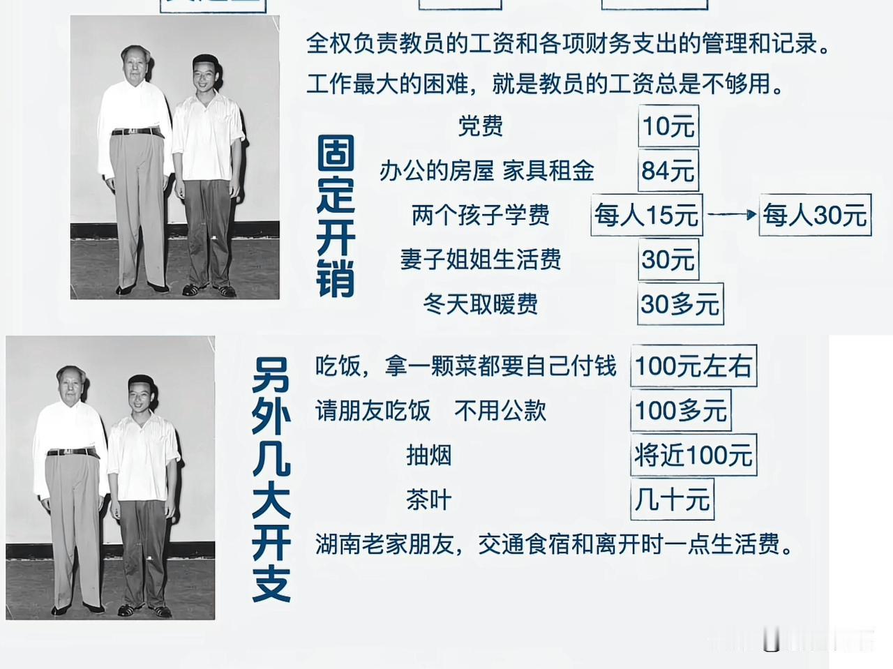 你肯定想不到,毛主席作为堂堂一国领袖,竟然连办公房屋和家具都是租的,连一颗白菜都需要用自己工资支付。 新中国成立后,原本毛主席原本拿着一级工资:610元。由于当时新中国刚刚成立,各行各业百废待兴,毛主席就主动把自己的工资降到三级:404.8元。 毛主席的工资都用来做什么呢?看完下面数据你就明白了。吴连登同志当时负责毛主席各项财务支出,他记录了毛主席工资的使用情况。 毛主席每月固定开支: 党费10元 办公房屋家具租金:80元 两个孩子学费:30元 妻子姐姐生活费:30元 取暖费:30多元 伙食费:100元,连一颗白菜都要支付。 请朋友吃饭:100元 抽烟:100元 茶叶:几十元 老家朋友来了,给一些交通食宿生活费。 这就是我们伟大的领袖毛主席,他从来不拿国家和人民的一针一线,处处以身作则,这样的人民领袖怎么会不受人民的爱戴呢! 伟人毛主席 请用一句话概括毛主席的一生 (图片来源网络)