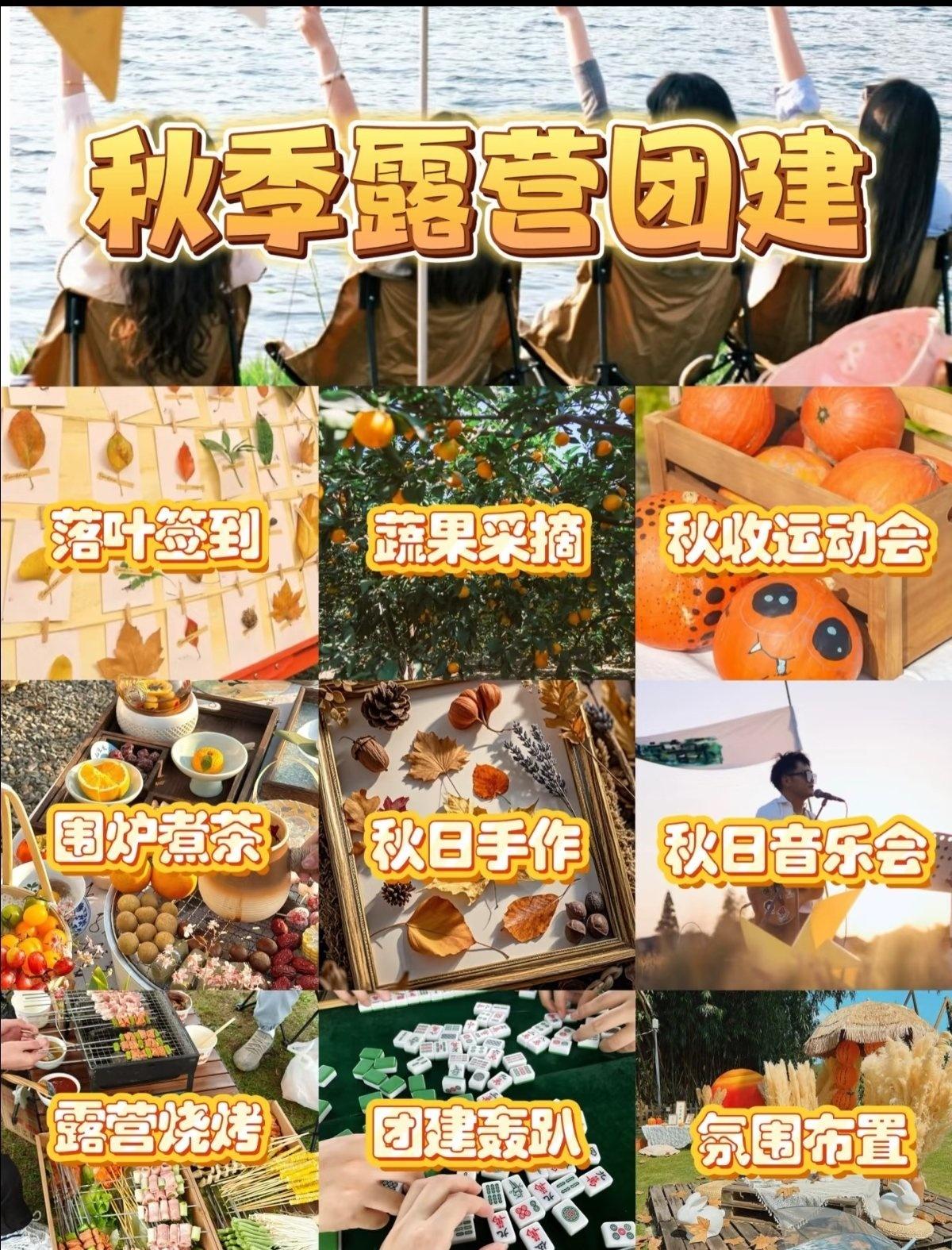 🍂秋季露营团建|把秋天的快乐一网打尽~ 谁懂啊!秋天和露营团建真的是绝配💯 🍁【落叶签到】捡片喜欢的叶子,写上名字,仪式感拉满,开启秋日美好~ 🍊【蔬果采摘】去果园里穿梭,亲手摘下沉甸甸的果实,收获的喜悦直接爆棚~ 🎃【秋收运动会】和小伙伴们来场趣味竞赛,在欢笑中拉近彼此距离~ 🔥【围炉煮茶】茶香混合着坚果、水果的香气,聊天发呆都超治愈~ 🎨【秋日手作】用落叶、松果做创意手工,成就感upup~ 🎵【秋日音乐会】伴着夕阳,听一场露天音乐会,氛围感直接拉满~ 🍢【露营烧烤】滋滋冒油的烤串,和好友碰杯,快乐到飞起~ 🎲【团建轰趴】麻将、桌游安排上,轻松又欢乐~ 🏕️【氛围布置】把营地装点得温馨又浪漫,随手拍都是大片~ 这个秋天,和小伙伴们来一场超棒的露营团建吧~