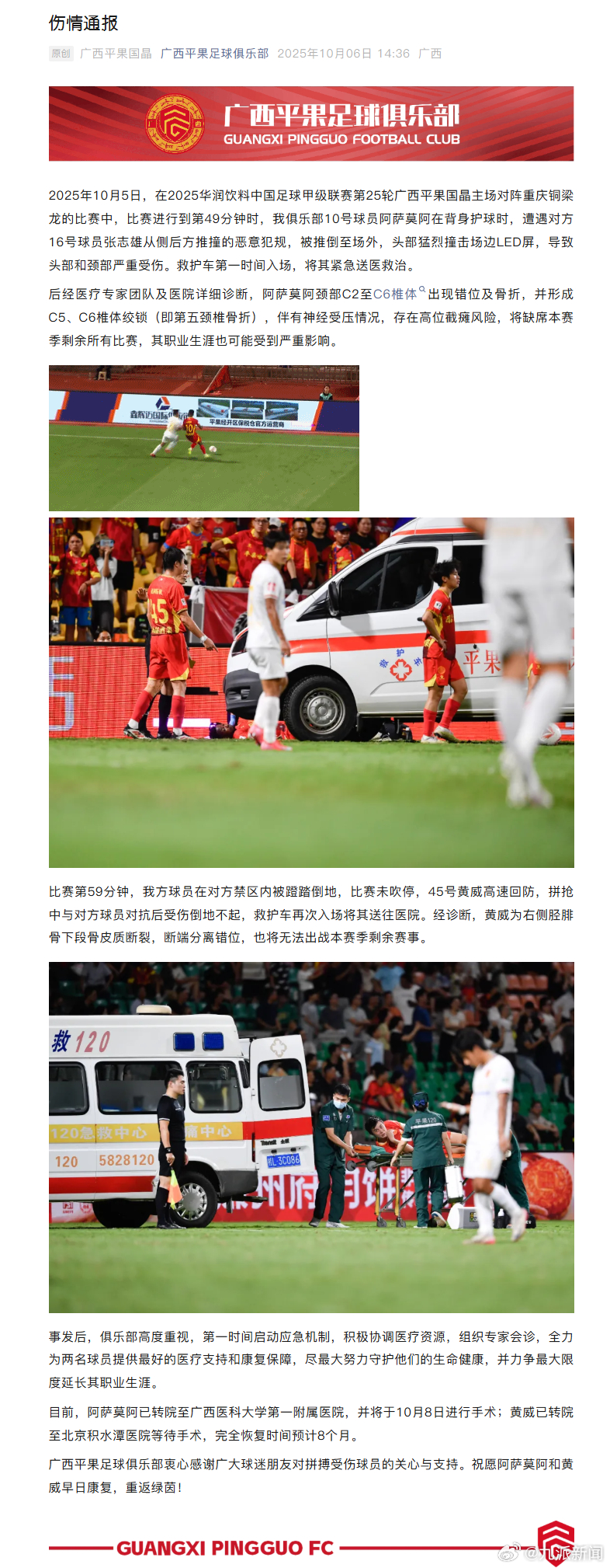 #广西平果俱乐部通报#【#广西平果受伤球员有高位截瘫风险#】广西平果俱乐部发布伤情通报:2025年10月5日,在2025华润饮料中国足球甲级联赛第25轮广西平果国晶主场对阵重庆铜梁龙的比赛中,比赛进行到第49分钟时,我俱乐部10号球员阿萨莫阿在背身护球时,遭遇对方16号球员张志雄从侧后方推撞的恶意犯规,被推倒至场外,头部猛烈撞击场边LED屏,导致头部和颈部严重受伤。救护车第一时间入场,将其紧急送医救治。