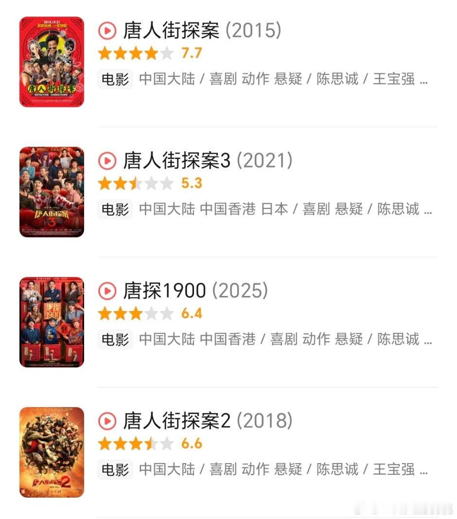 陈思诚唐探系列,最近的唐探3票房45e,评分不及格;1900票房36e