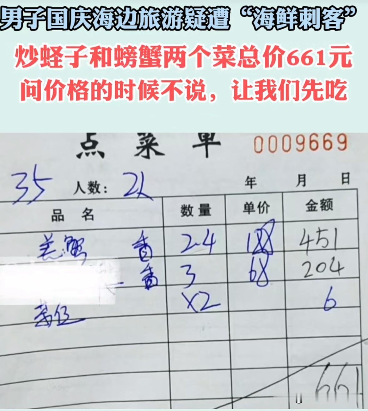 广东一男子带着家人去海边旅游,吃饭的时候遇到“海鲜刺客”,两个菜661元! 男子
