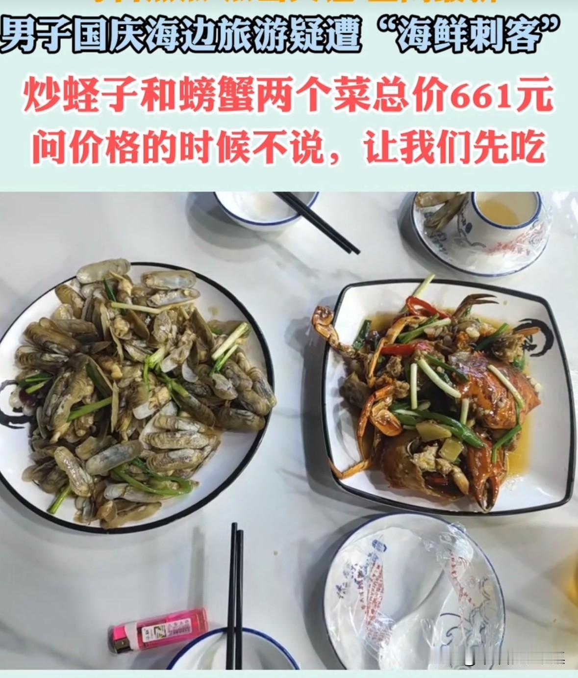 广东一男子带着家人去海边旅游,吃饭的时候遇到“海鲜刺客”,两个菜661元! 男子说:“吃饭前,问他们菜的价格,他们也不说,吃过饭后,直接拿个账单给我!” 一盘炒蛏子,一盘炒螃蟹看着都不新鲜了,居然这么贵!是不是专门宰外地人。 这家店确实不地道! 打工商局投诉,维护自身权益! 以后菜价不明确的饭店,立刻就走!