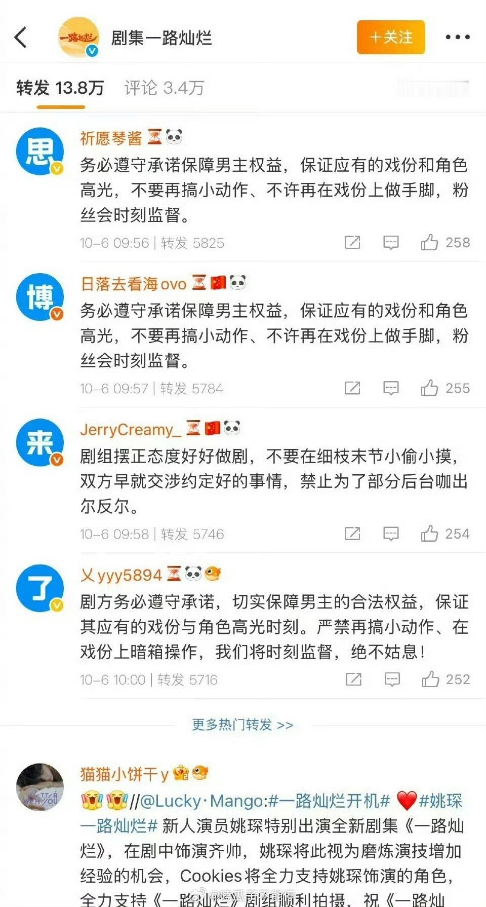 所以田嘉瑞粉丝在姚琛官宣博转发排字,是为了保障男主的利益吗?一路灿烂这剧咋啦?不