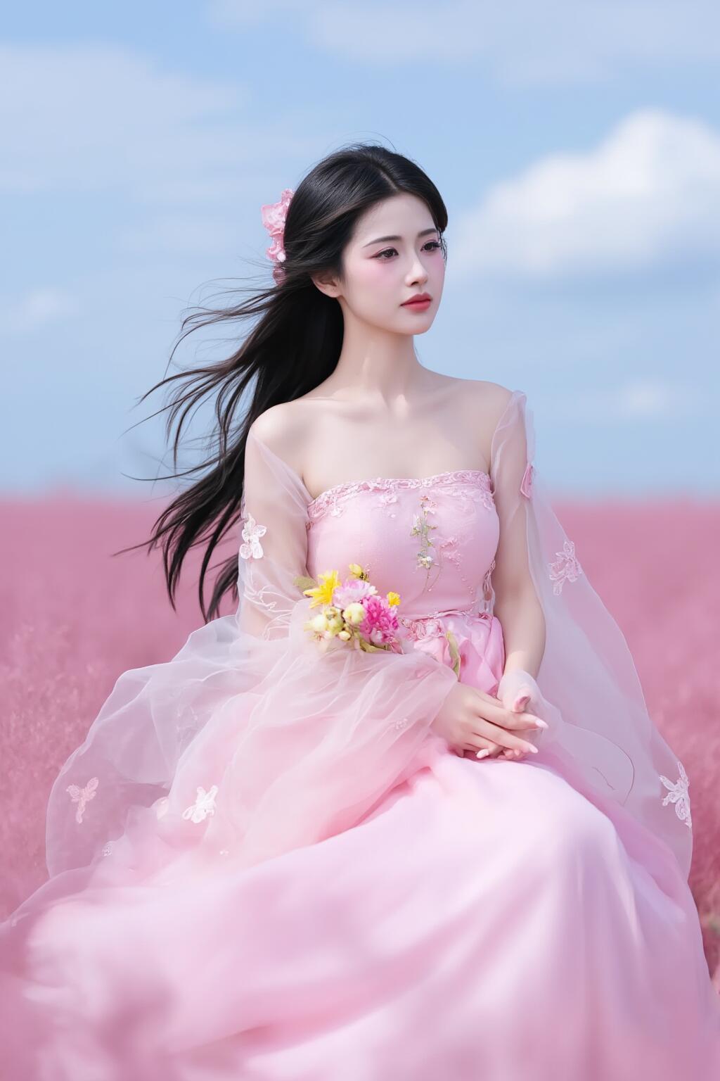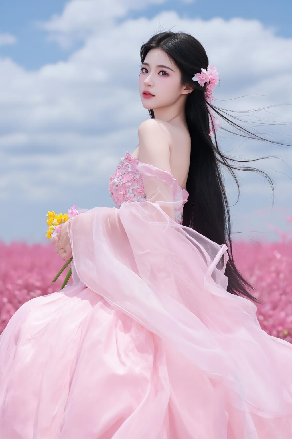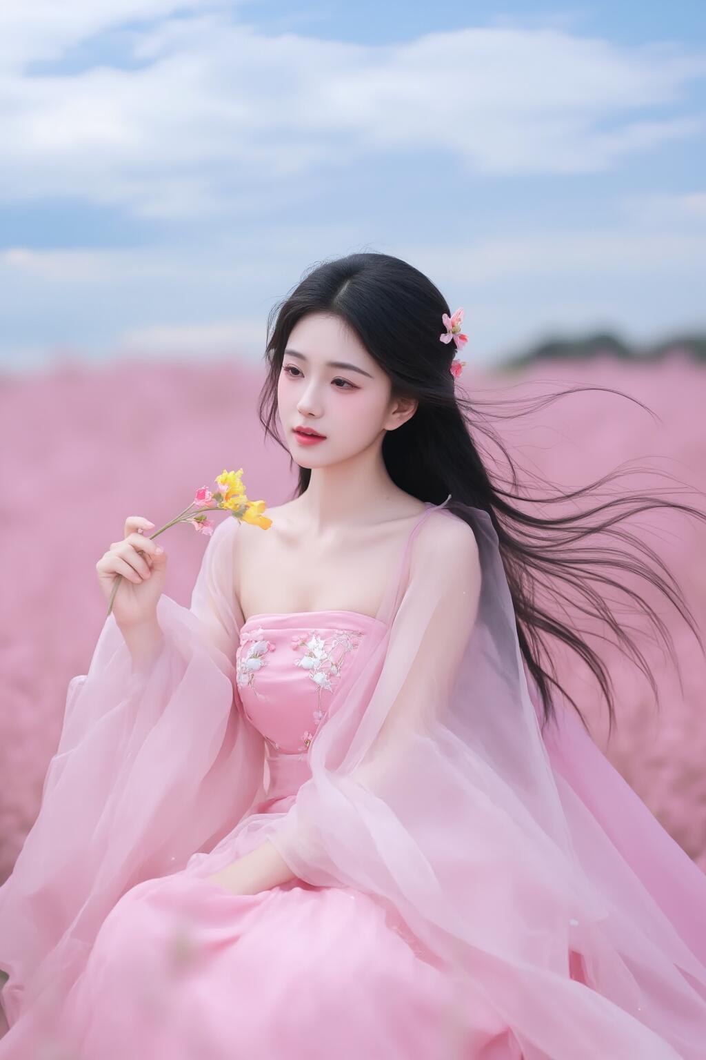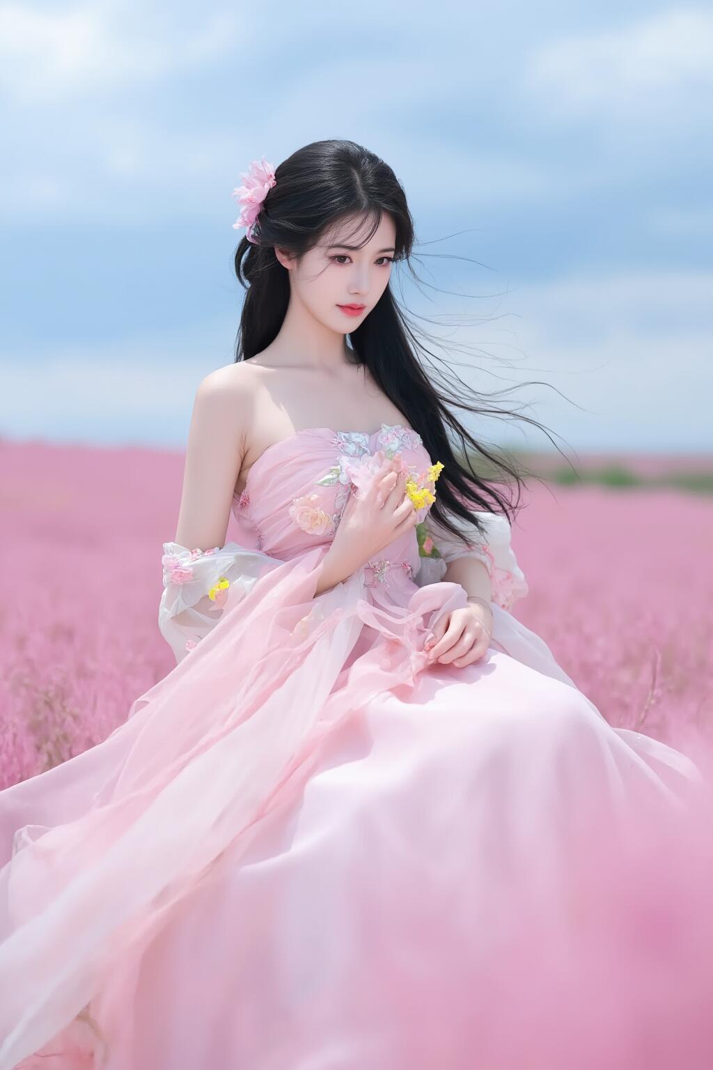 梦幻粉裙少女粉裙仙女 花海中的仙子