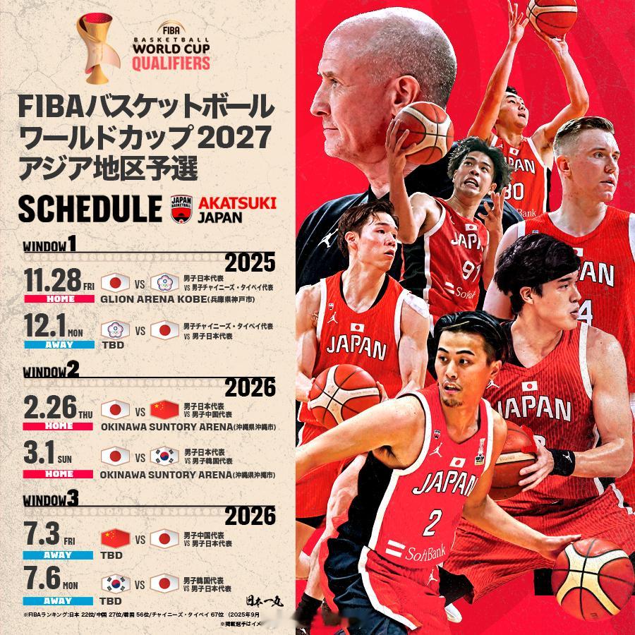 第一窗口期,11月28日,日本男篮对阵中国台北,主场在神户。