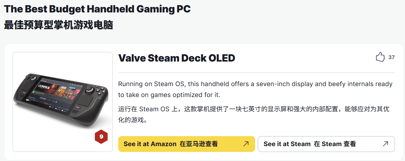 Steam Deck,IGN给出了9分的评分, Steam Deck是推动PC 机游戏革命普及的功臣,得益于 API Proton,Steam Deck 支持从《赛博朋克 2077》到《极限竞速:地平线 5》等数十款针对便携设备优化的游戏。Steam Deck 的 OLED版本,对于喜欢更大、更亮、色彩更鲜艳屏幕的用户来说。虽然仍然以 1200x800 的分辨率显示,但Steam Deck OLED提供了明显的差异,提供了更清晰的视觉体验。