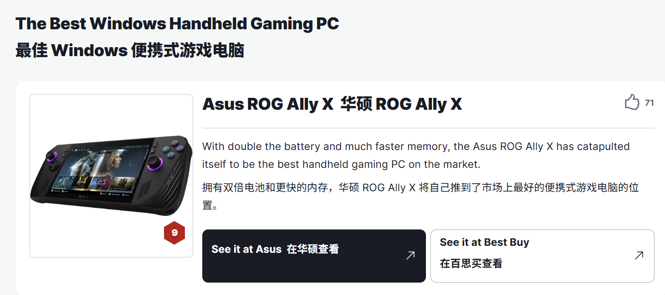 华硕 ROG Ally X,IGN给出了9分的评分, 华硕 ROG Ally X是目前市面上运行Windows的最佳游戏掌机设备。Z1 Extreme 处理器搭配了 24GB 的 LPDDR5 内存,频率为 7,400MHz,比原始型号的 16GB RAM 大幅提升。