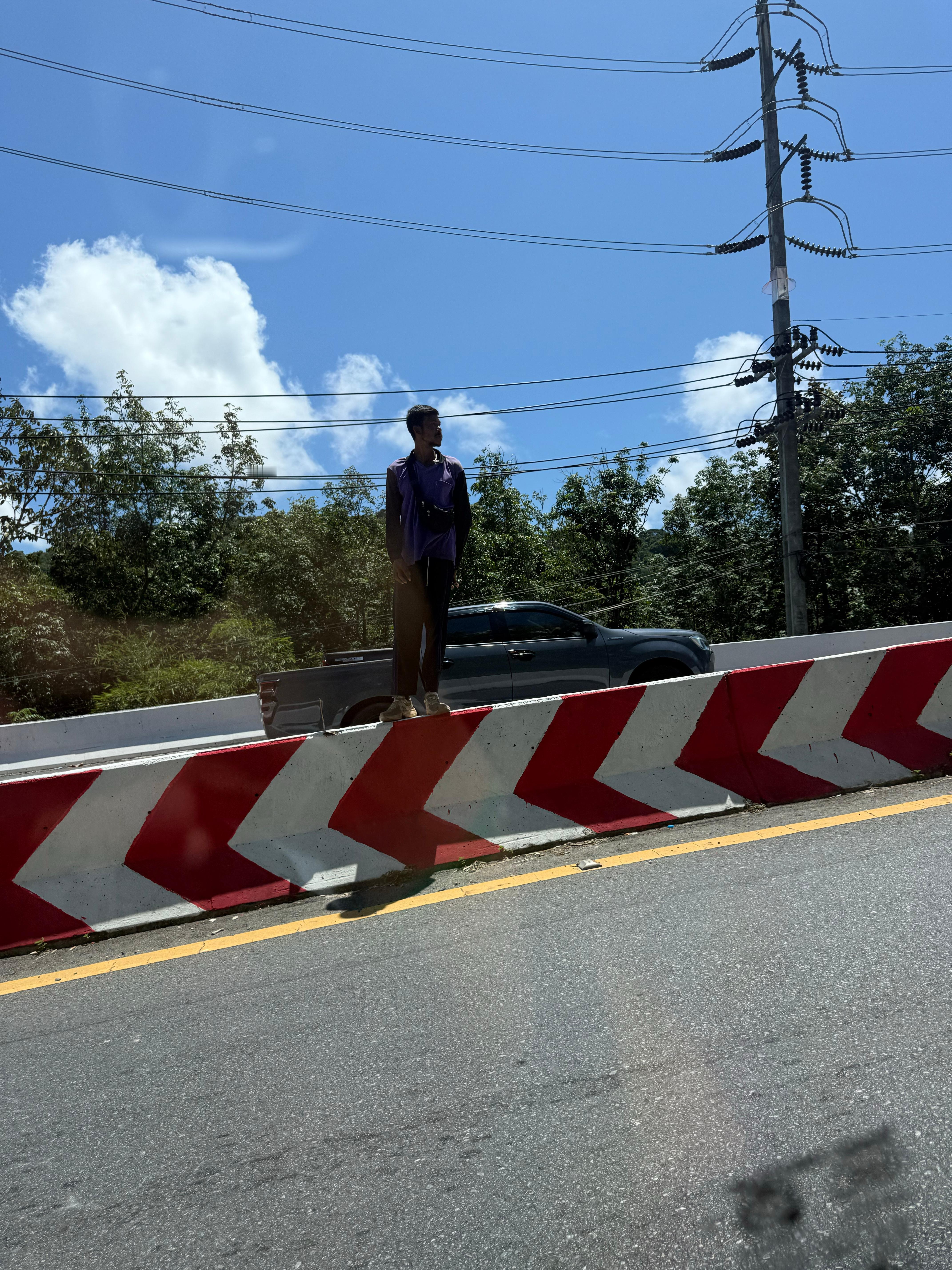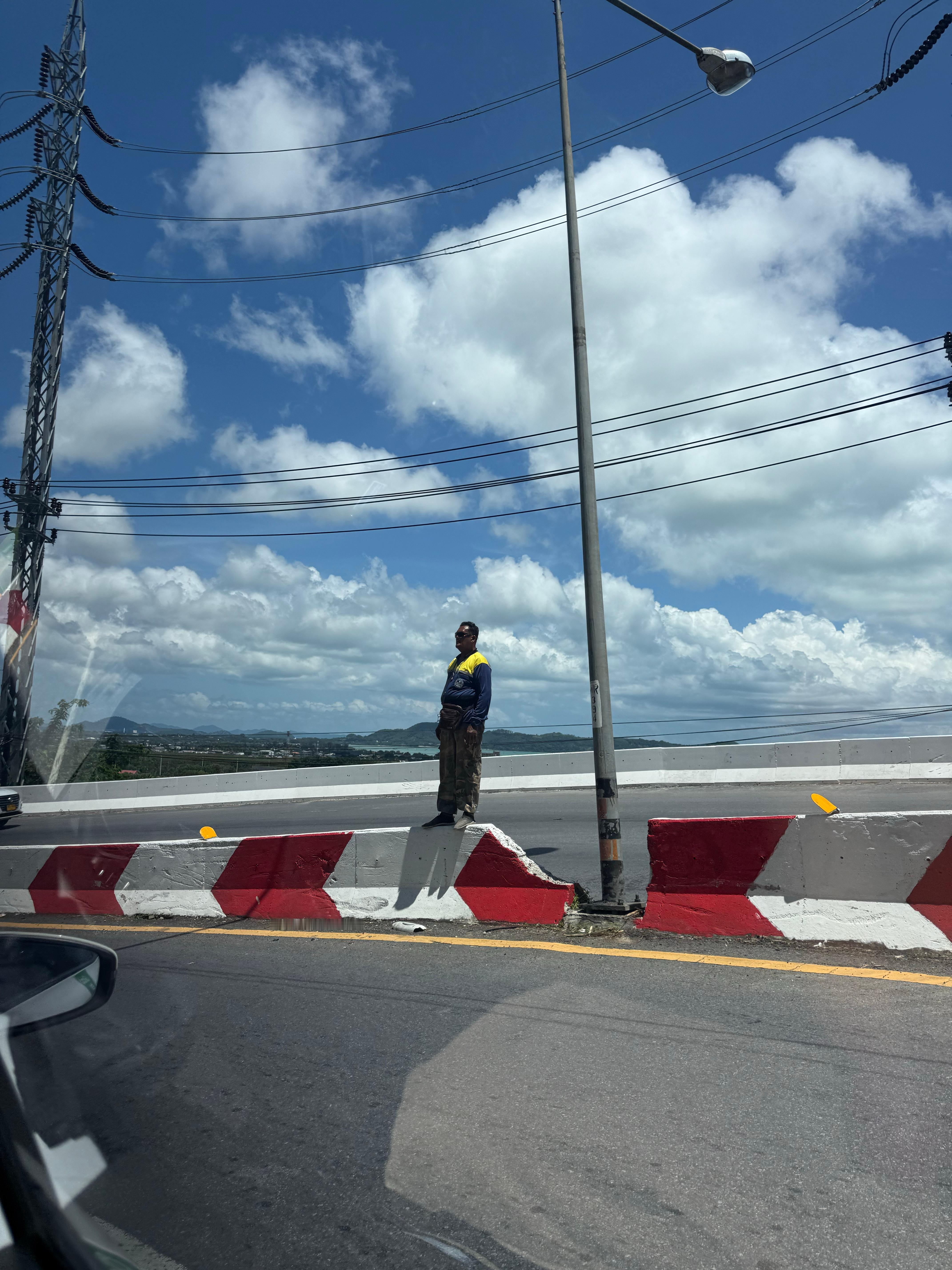 这边人修路真的原始看路况在隔离带上,一会一个人在眺望