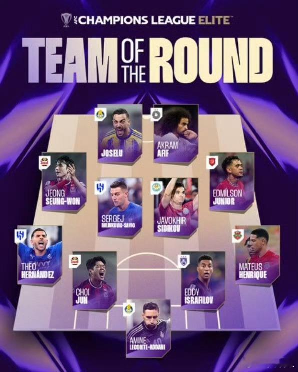 亚冠官方公布亚冠精英联赛第二轮最佳阵容,何塞卢、特奥、米林科维奇领衔,中超无人入选。
