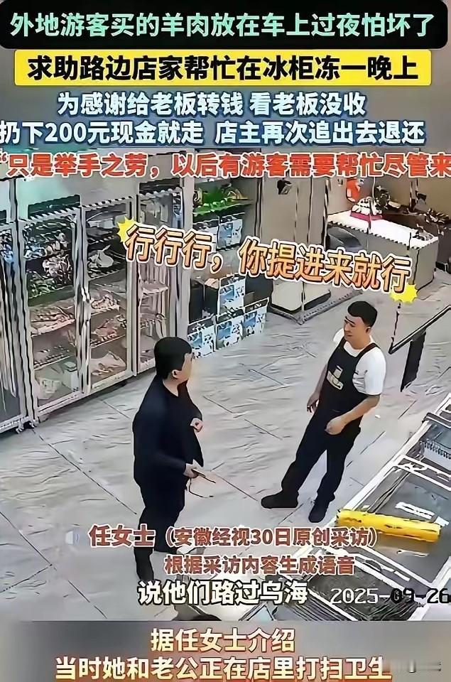 河北游客小王在内蒙草原买了一只肥羊,盛夏高温让羊肉在车里开始发黏。酒店没有冰柜,他抱着最后希望走进街角杂货店。 老板是个晒得黝黑的中年汉子,听到请求立即起身:多大点事儿!他利落地腾出冰柜空间,铺上干净塑料布,把羊肉小心放进去。当小王掏出200元时,老板笑着摆手:举手之劳,下次来买瓶水就行。 这种草原式的慷慨,与某些景区明码标价的充电器使用费形成鲜明对比。老板看似亏了200元,却赢得了顾客的真心推荐。后来小王的宣传让店铺生意更红火,印证了草原人的智慧:真诚才是最好的生意经。 在处处讲求回报的时代,这个冰柜故事让我们看到:真正的精明,是懂得用善意播种长远。您是否也遇到过这样的温暖瞬间?欢迎分享您的故事。