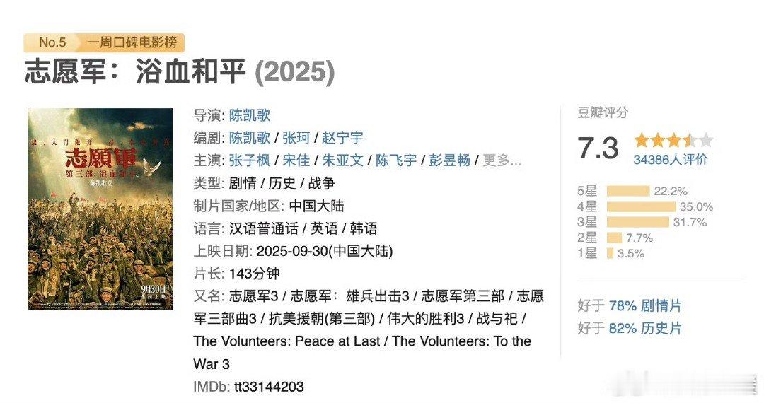 国庆档电影豆瓣评分都来瞧,刚和全家看完《志愿军:浴血和平》,真不愧是系列最佳。看到英雄身影,文字有了真切诠释,对孩子来说,是珍贵历史课,值得二刷~