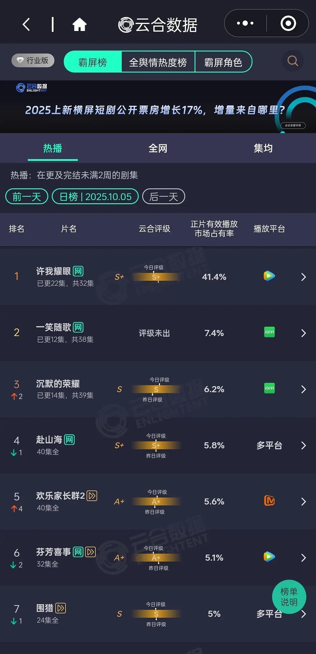 10.5云合 许我耀眼41.4%,一笑随歌7.4%,沉默的荣耀6.2%,合理吗怎么评级还降了?就算只看峰值也不可能降低了啊