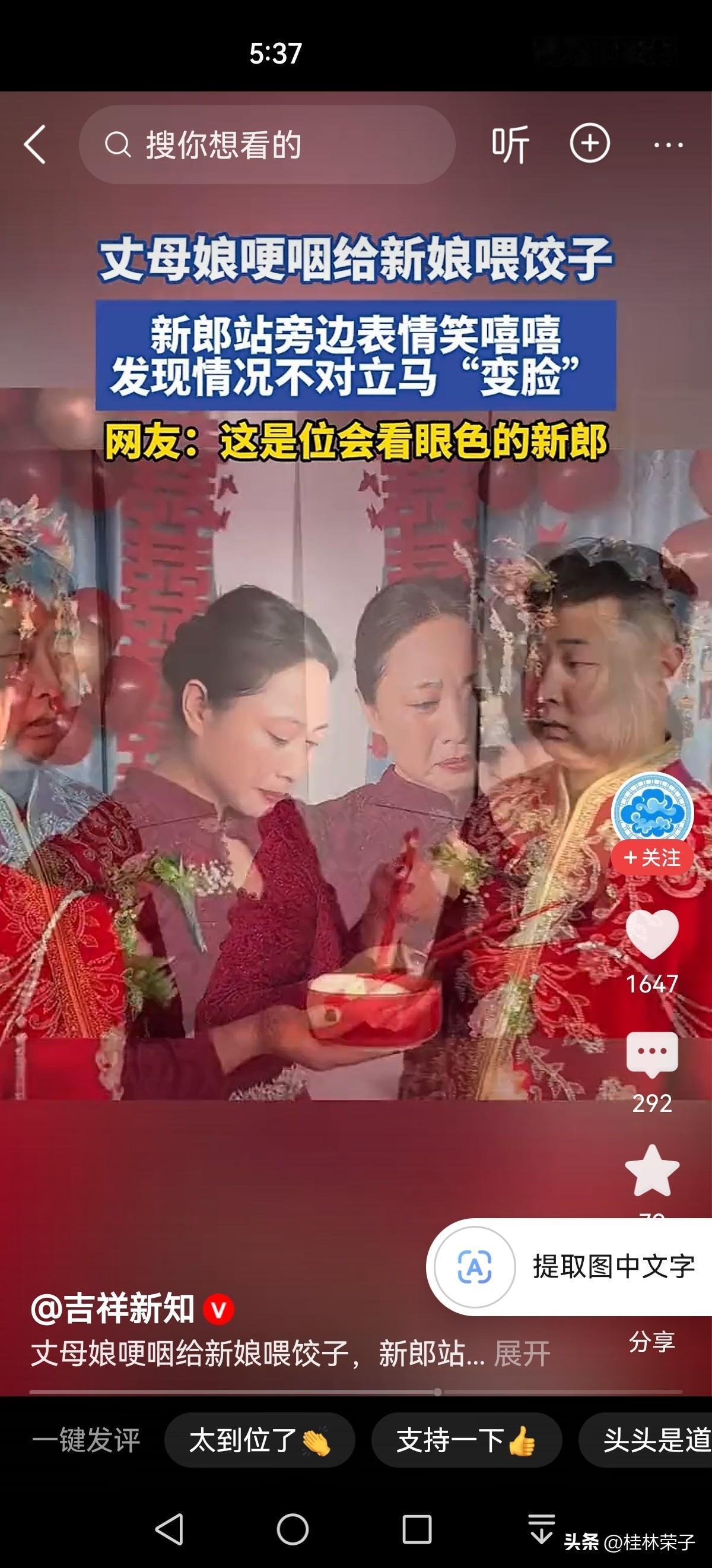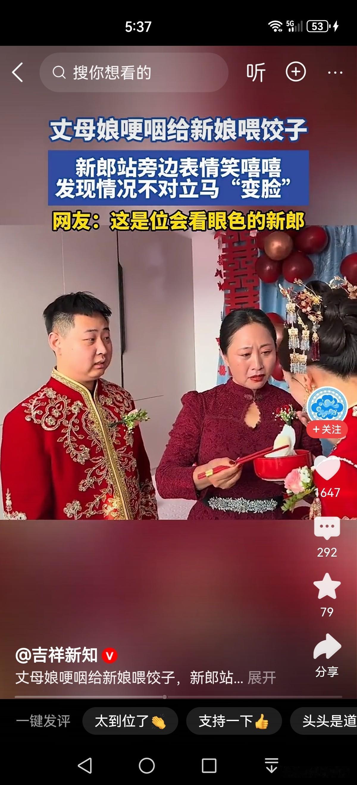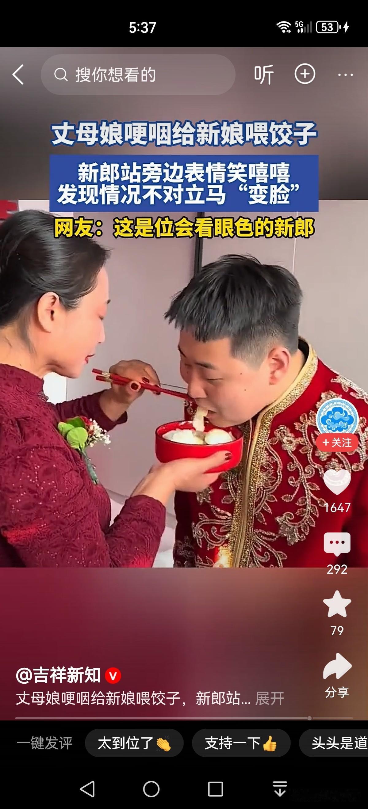 新娘结婚大喜之日, 丈母娘给女儿喂饺子, 新郎笑脸相迎。 当看到丈母娘在给新娘喂