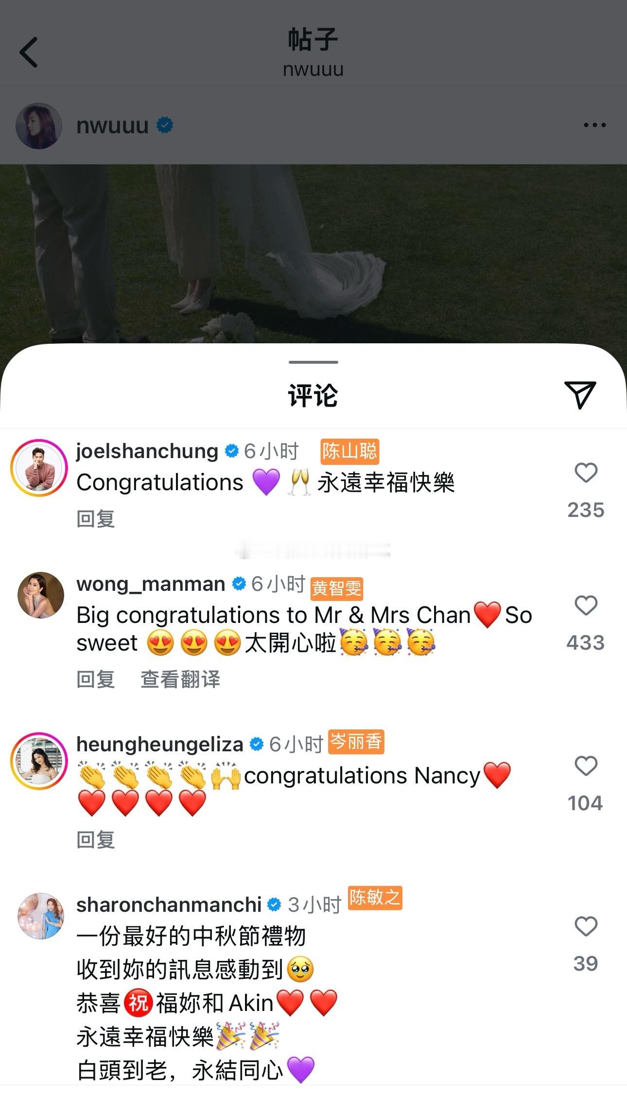 胡定欣结婚,圈内好友送祝福。胡定欣当时为了保护这段恋情,每次出入都非常低调,除了「胡说八道会」的闺蜜、以及洪永城和林盛斌两位牵红线的「媒人」外,得悉恋情的人很少。
