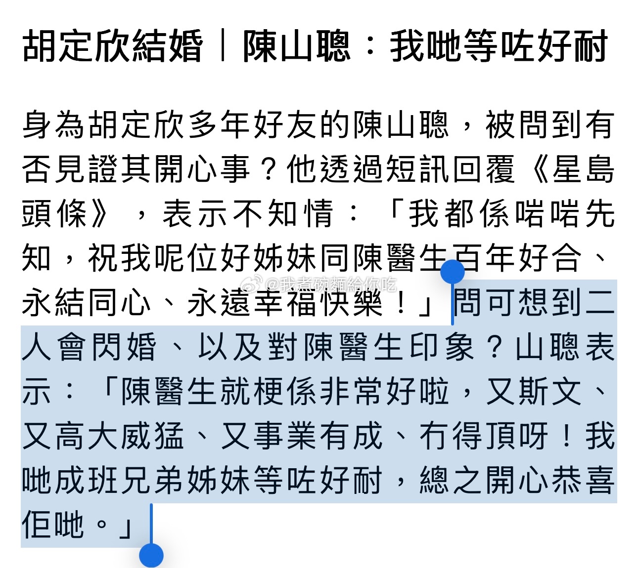 今日有媒体联络陈山聪及陈展鹏,被问到有否见证其开心事,陈山聪回复表示不知情,也都是刚刚才知。问可想到二人会闪婚以及对陈医生的印象,陈山聪表示:「陈医生非常好,又斯文、又高大威猛、又事业有成、冇得顶呀!我们这班兄弟姐妹等了很久,总之开心恭喜他们。」