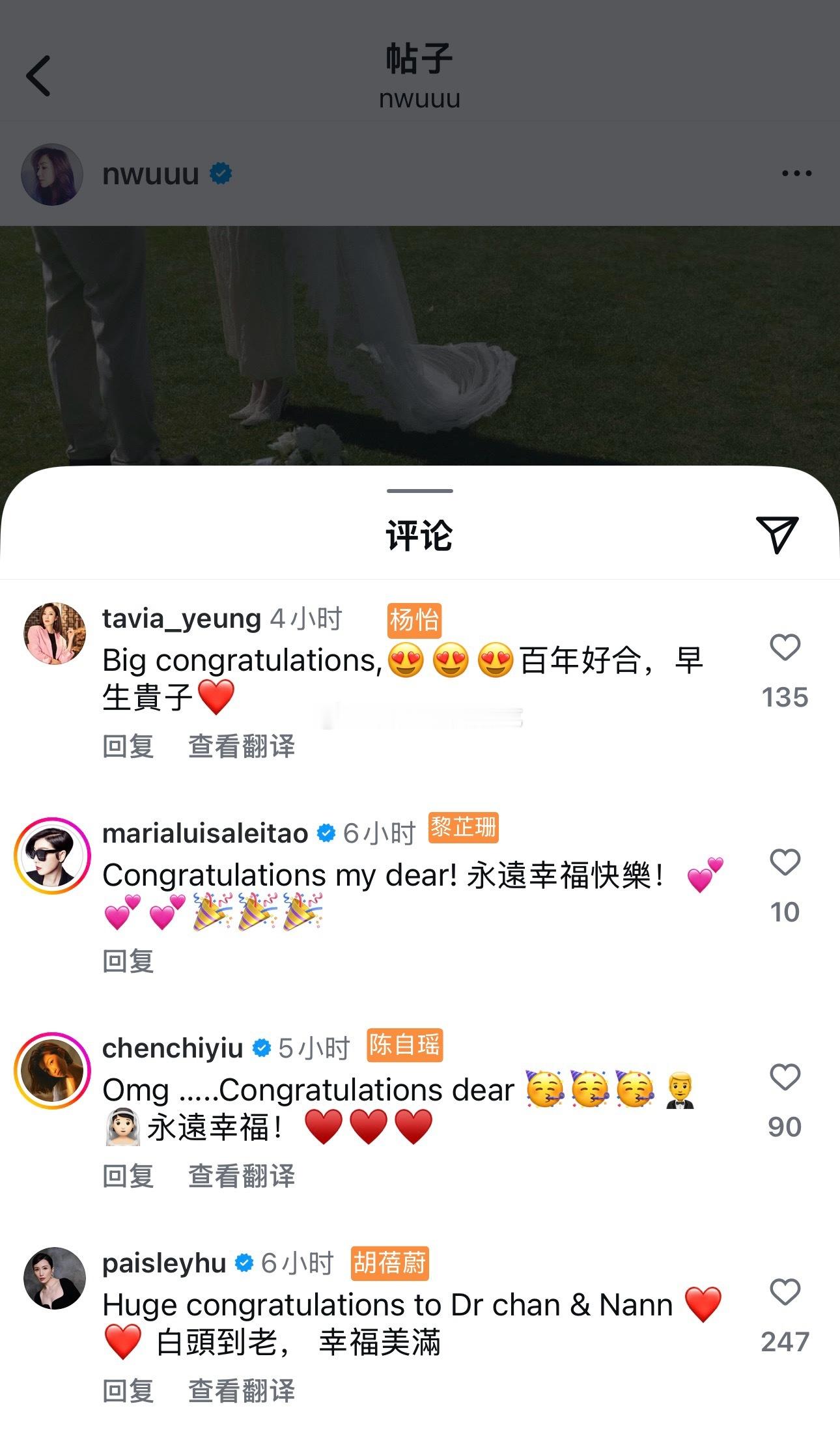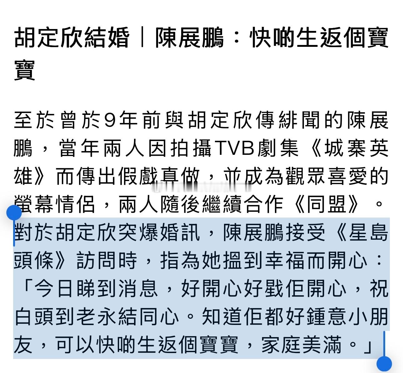 陈展鹏为胡定欣找到幸福而开心:「今日看到消息,好开心好替她开心,祝白头到老永结同心。知道她很喜欢小孩,可以快点生个宝宝,家庭美满。」