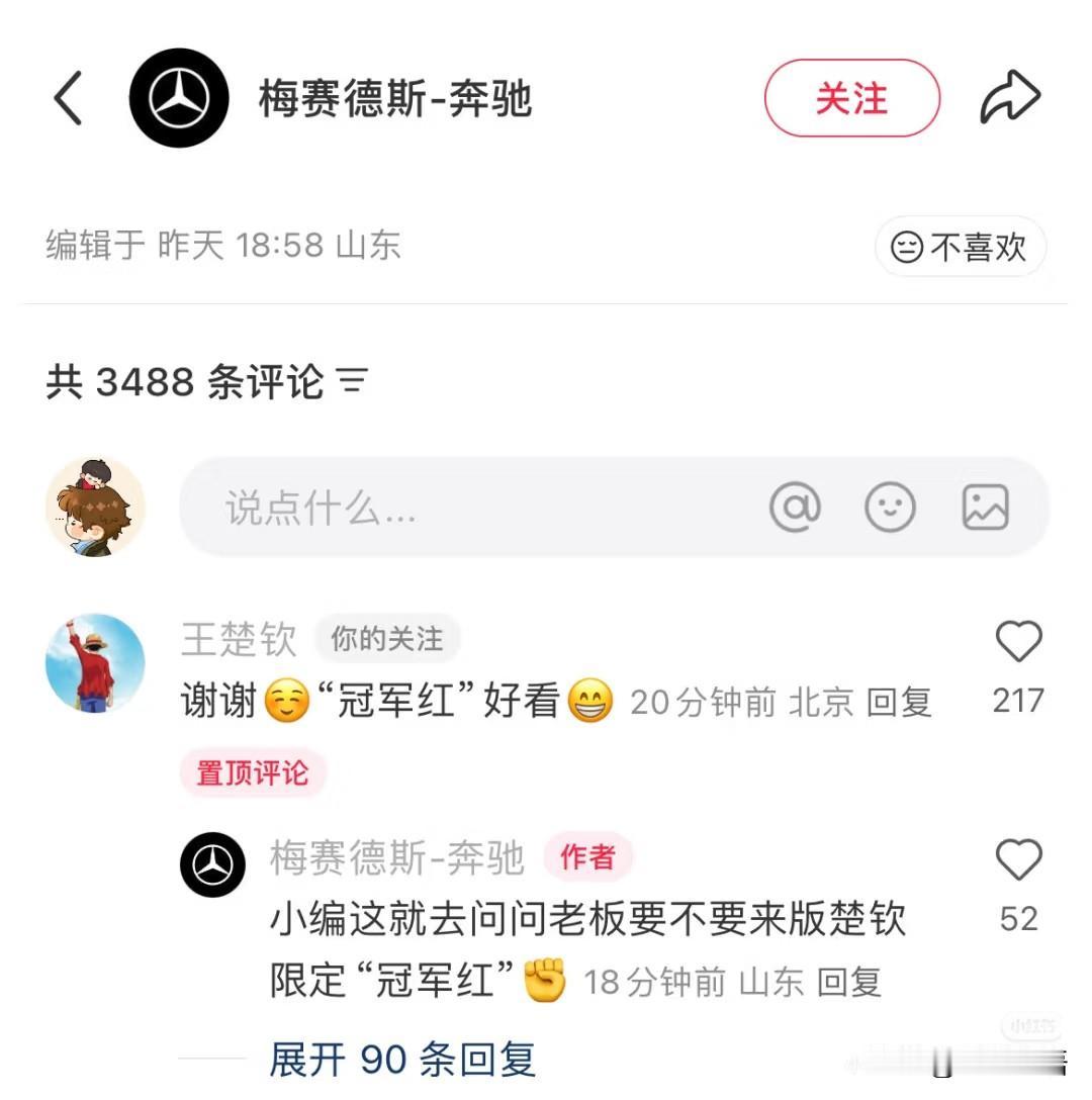 刚刚看到王楚钦和奔驰互动了,昨天王楚钦忙着比赛,没时间上网,大家说:“看来楚钦这