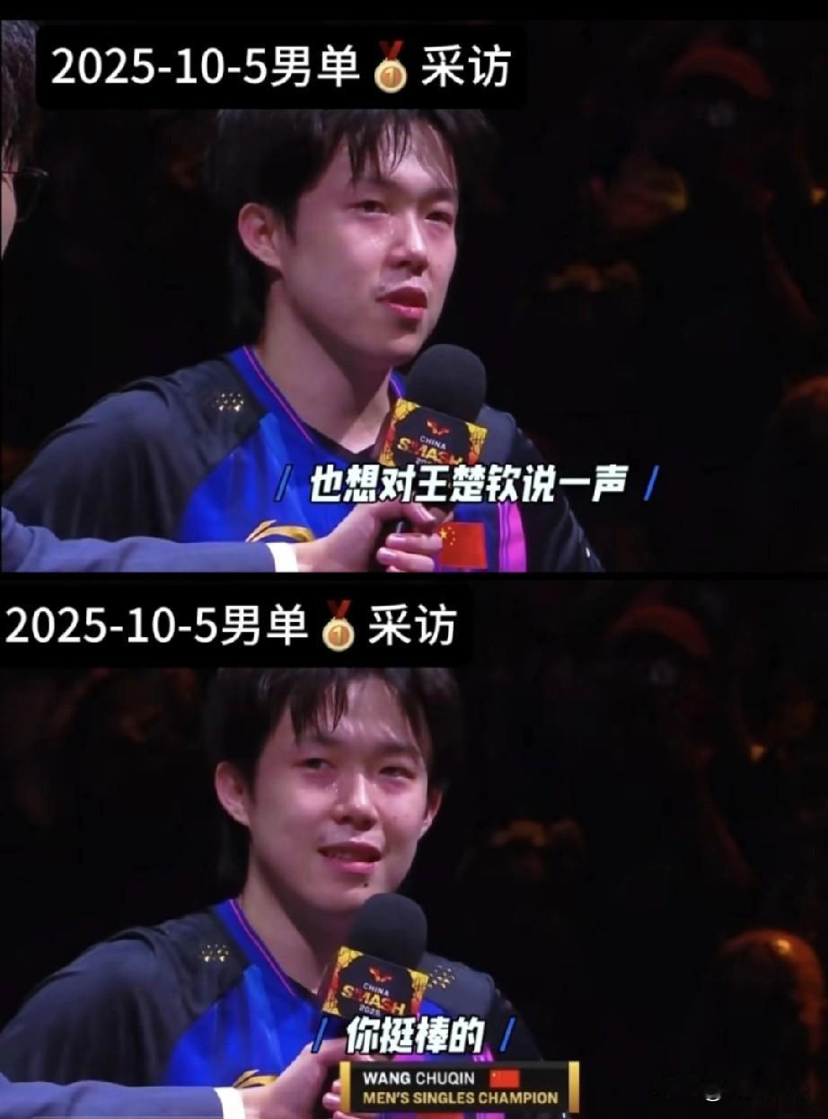 刚刚看到王楚钦和奔驰互动了,昨天王楚钦忙着比赛,没时间上网,大家说:“看来楚钦这是刚睡醒,开始上网了。”王楚钦说:“谢谢,冠军红好看”,奔驰的小编说去问问老板要不要来版楚钦限定“冠军红”,这个估计会有的,品牌方对楚钦真的真用心。 刚刚看到麒麟也发了动态,说月圆家圆,祝贺王楚钦获得三冠王。而且麒麟还很细节,今天是中秋节,在公众号关注麒麟,输入“中秋快乐”后,就会出来王楚钦的中秋祝福,真好。而且麒麟给楚钦和爸爸妈妈拍的短片,也是充满温情,看到爸爸妈妈眼里对楚钦的心疼,也看到楚钦在爸爸妈妈跟前笑的很开心。 短片里妈妈说“三冠王”,这不楚钦就拿到三冠王了,但是过程确实不容易,昨天的男单半决赛把很多人都看哭了,在责任面前,他是硬扛下来。赛后采访,王楚钦说:“也想对王楚钦说一句,你挺棒的。”