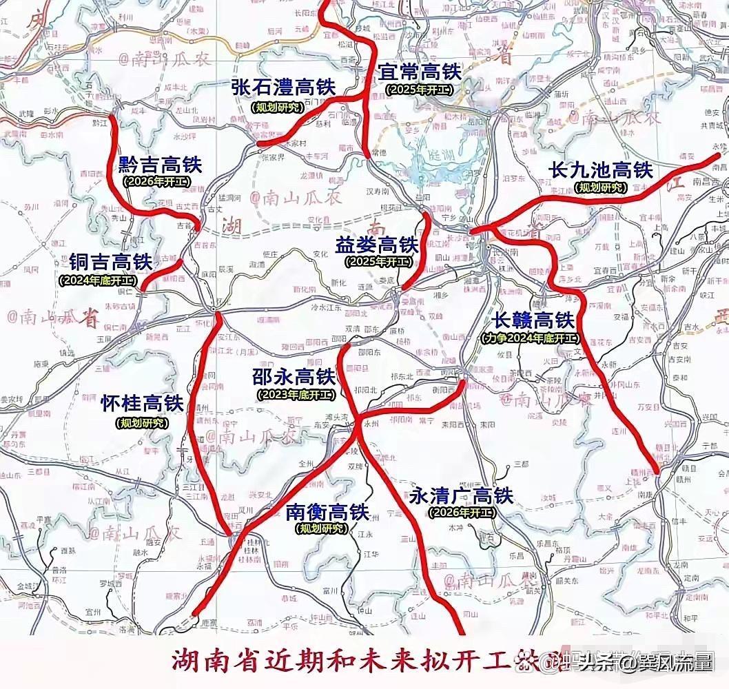 湖南高铁建设高峰期真的来了!目前在建的有三条:邵永高铁、铜吉高铁、长赣高铁。 今年即将开工的宜常高铁已经环评批复,初步设计10月20日左右完成,很快也能实质性建设。 2026年,湖南还会有两条高铁要建设,广清永高铁和黔吉高铁。明年湖南同时在建的高铁将达到6条。后续还有益娄高铁和澧石张高铁要建设,这也是入规的项目。 有人可能觉得湖南建那么多高铁没必要,其实湖南相比周边各省已经掉队了。现在是在补作业,还历史旧账。湖南的高铁密度是中东部最低的,未来等这十来条高铁建成,出行会方便很多。