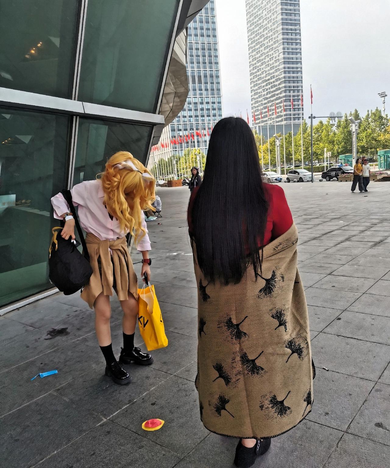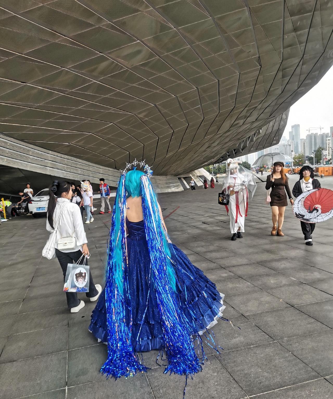 这个动漫展的主题是以“喵基”文化为核心,融合二次元创作、游戏互动及同人交流 参展的人真多,穿着打扮各异,叫你眼花缭乱,都叫不上名来。 国内的,国外的,古今的,现代的,男扮女装的,女扮男装的等等无奇不有,无所不包…… 天下着小雨,我打着伞慢悠悠的走着。 一个漂亮的小女生穿着一袭蓝色拖地长款吊带连衣裙,头上戴着“凤冠霞帔”,这个我说的可能不太准确,我真不知道应当怎么说才对,大概就这个意思吧! 向我微笑,我说你好漂亮啊,我随手给她照了这张照片(图一),多可爱的一个小姑娘,看看她的后背是这个样子的(图二)。 其实对于这个动漫展,我不太了解,但是年轻人特别的喜欢,他们装扮成各种造型,打扮的漂漂亮亮的,看她们真的比过年还高兴! 对我而言年事已高,但是我不排斥年轻人的这种打扮和爱好。 毕竟这是一种文化的交流,同时为动漫企业提供展示,与招商渠道,符合大连打造,动漫+旅游城市名片的方向。 活动与同其他的艺术展如陶艺展青春秀场形成联动,丰富市民国庆假期文化生活,提升城市文化活力! #秋日生活打卡季#