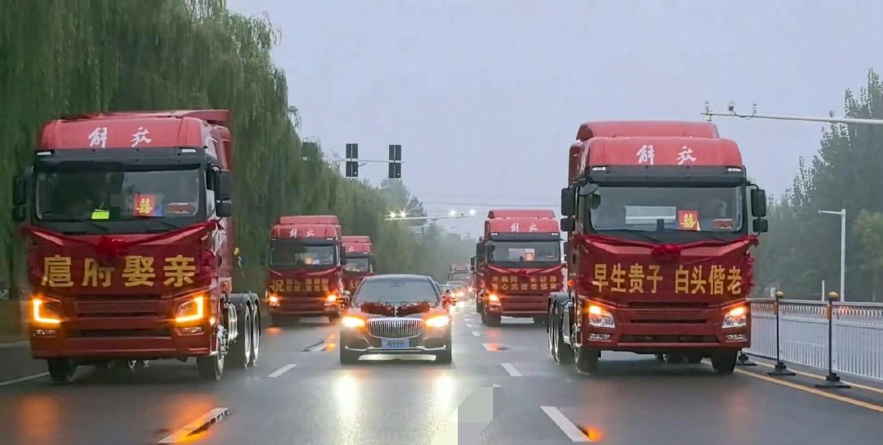 这样排面的婚礼是我见过的最大的了,这压迫感实在是没法比。山东一位姓扈的哥们儿非常喜欢卡车,于是灵机一动在结婚时居然在婚车两边采用了六辆大卡车在两边并行。看起来比某些小国家的阅兵式还要具有排面。但同时也有人提出疑问,那就是大卡车没有上牌照能上路吗?还有如果是采用这种方式行进,考虑过车队后社会车辆的时间宝贵性吗?其父亲解释说,这样并行占道只是临时的,但看看这两张照片里车辆的灯光就知道占用时间长不长了。其实,采用这样有排面的创意来接亲我还是很能理解的,但一切都要合理合法,而且还要不太影响其他车辆的通行才行。所以,如果只是拍摄留恋,强烈建议在非公共马路上拍摄就行了,如果放到公共马路上就过了! #万能生活指南#