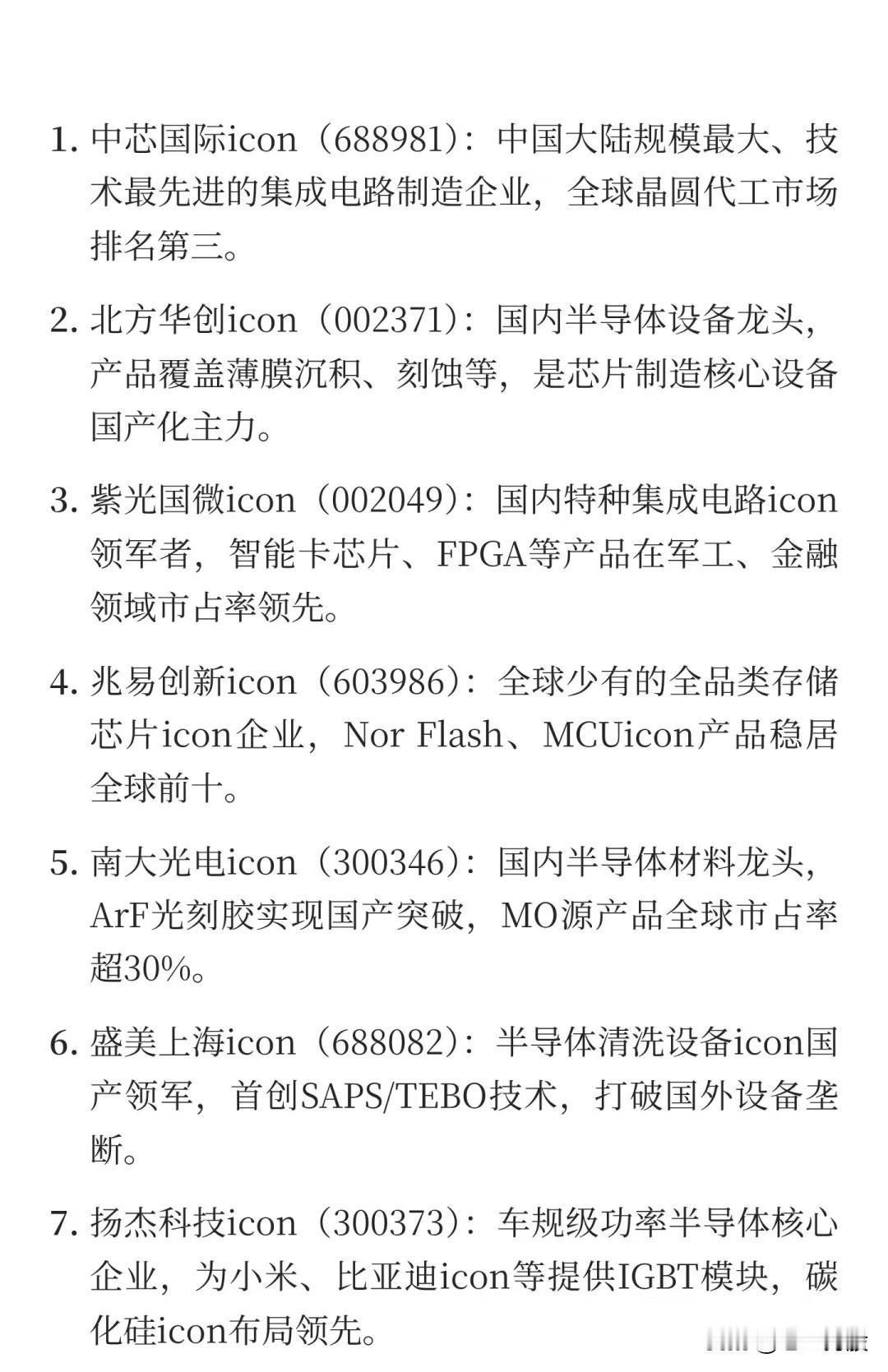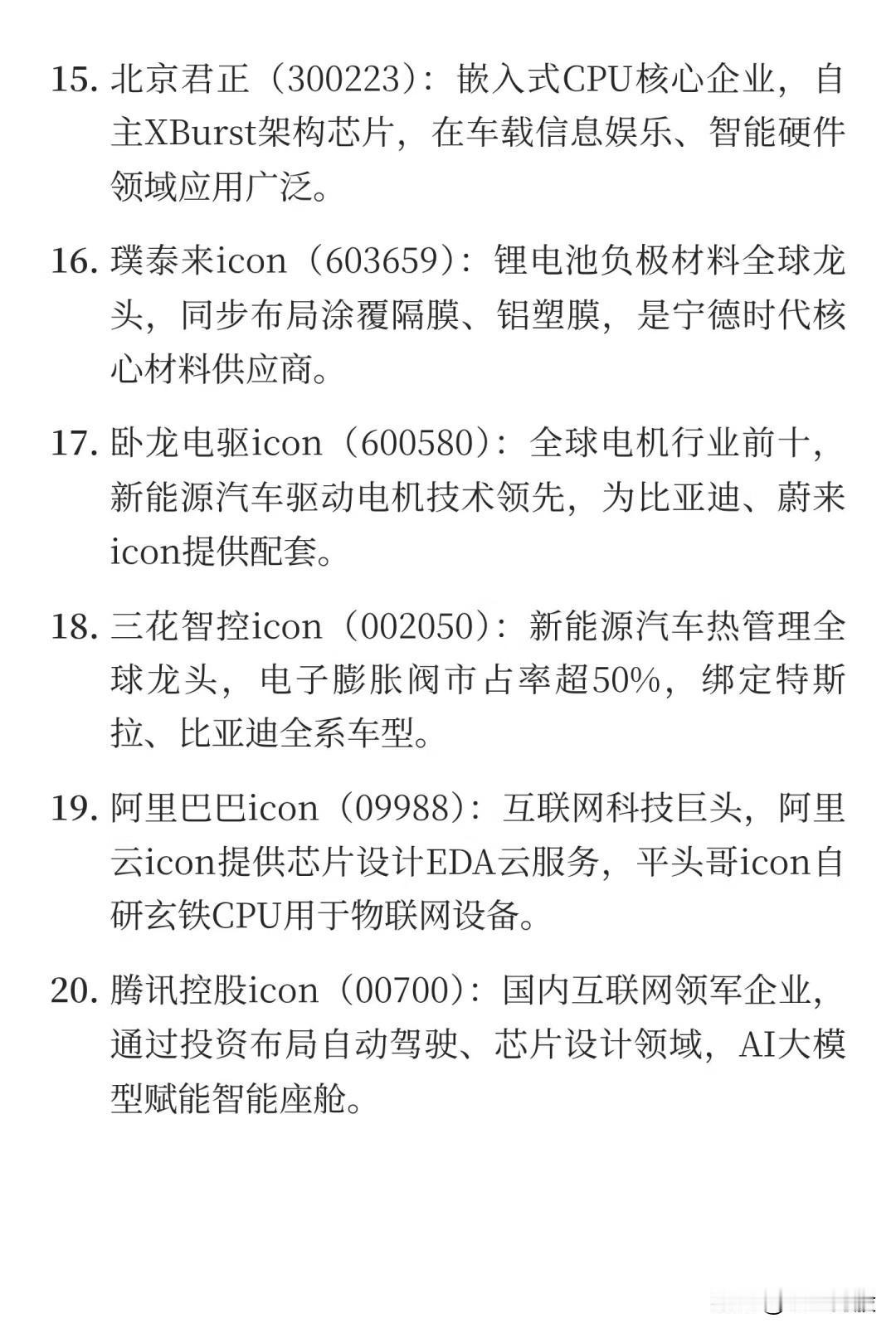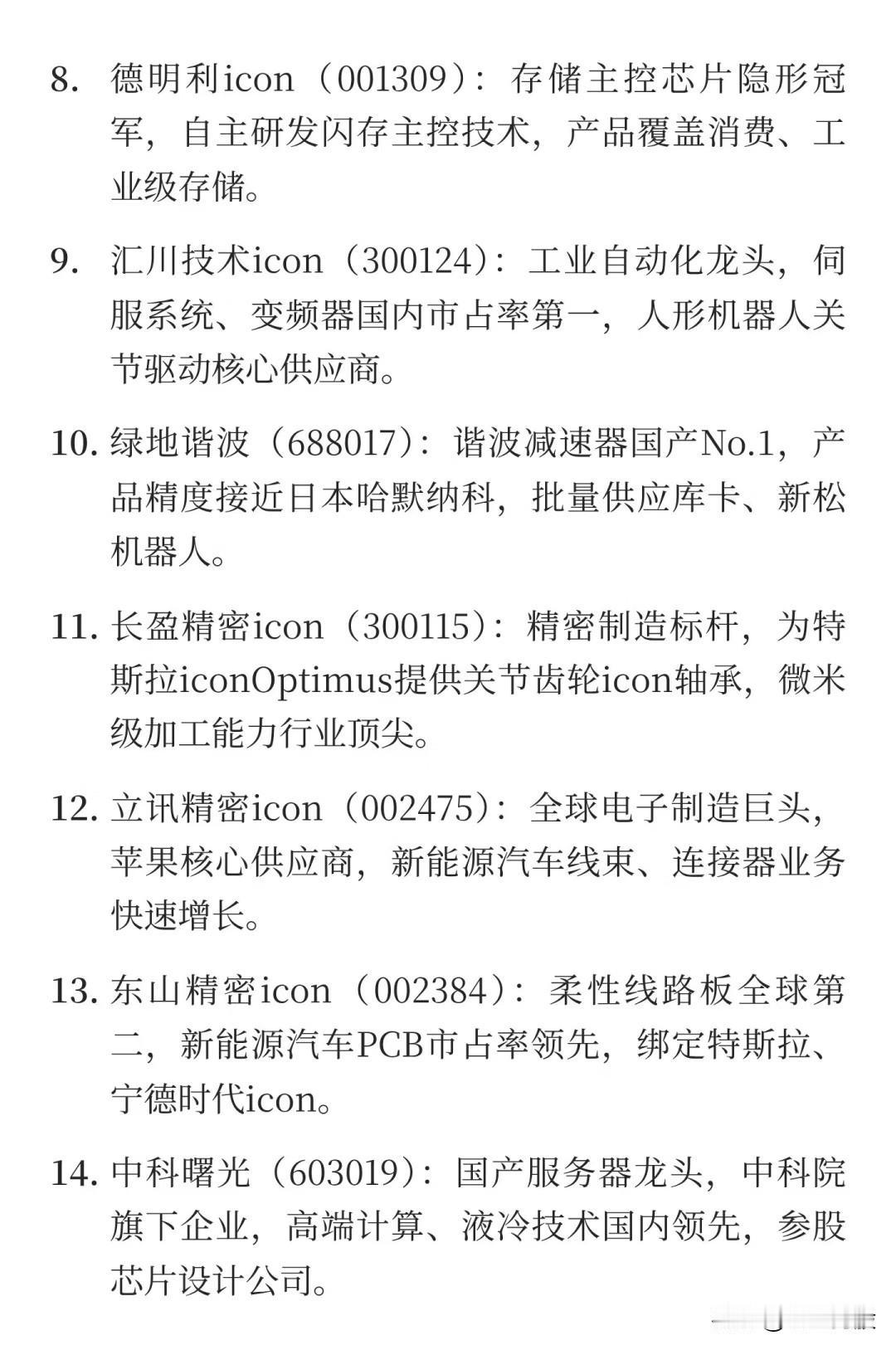 “本轮大牛市20只金股名单”,聚焦于半导体、新能源汽车、工业自动化、芯片、智能制造、新能源材料、互联网科技等前沿科技与高端制造领域。 一、半导体与芯片领域(核心制造与材料) 1. 中芯国际(688981) - 中国大陆规模最大、技术最先进的集成电路制造企业,全球晶圆代工市场排名第三。 2. 北方华创(002371) - 国内半导体设备龙头,产品覆盖薄膜沉积、刻蚀等关键工艺,是芯片制造核心设备国产化的主力军。 3. 紫光国微(002049) - 国内特种集成电路领军者,智能卡芯片、FPGA等产品广泛应用于军工、金融等领域,市占率领先。 4. 兆易创新(603986) - 全球少有的全品类存储芯片企业,Nor Flash、MCU产品稳居全球前十。 5. 南大光电(300346) - 国内半导体材料龙头,ArF光刻胶实现国产突破,MO源产品全球市占率超30%。 6. 盛美上海(688082) - 半导体清洗设备国产领军企业,首创SAPS/TEBO技术,打破国外设备垄断。 7. 德明利(001309) - 存储主控芯片领先企业,产品覆盖消费级与工业级存储,拥有自主闪存主控技术。 8. 北京君正(300223) - 嵌入式CPU核心企业,自主XBurst架构芯片,广泛应用于车载信息娱乐与智能硬件。 二、工业自动化与精密制造 9. 汇川技术(300124) - 工业自动化龙头,伺服系统、变频器国内市占率第一,是人形机器人关节驱动的核心供应商。 10. 绿地谐波(688017) - 谐波减速器国产第一,产品精度接近日本哈默纳科,批量供货库卡、新松等机器人厂商。 11. 长盈精密(300115) - 精密制造标杆企业,为特斯拉Optimus人形机器人提供关节齿轮与轴承,微米级加工能力突出。 12. 立讯精密(002475) - 全球电子制造巨头,苹果核心供应商,同时新能源汽车线束与连接器业务快速崛起。 13. 东山精密(002384) - 柔性线路板全球第二,新能源PCB领域领先,绑定特斯拉、宁德时代等新能源巨头。 14. 中科曙光(603019) - 国产服务器龙头,中科院旗下企业,高端计算与液冷技术国内领先,并参股芯片设计公司。 三、新能源汽车与核心零部件 15. 璞泰来(603659) - 锂电池负极材料全球龙头,同时布局涂覆隔膜、铝塑膜,是宁德时代的核心材料供应商。 16. 卧龙电驱(600580) - 全球电机行业前十,新能源汽车驱动电机技术领先,为比亚迪、蔚来等车企提供配套。 17. 三花智控(002050) - 新能源汽车热管理全球龙头,电子膨胀阀市占率超50%,绑定特斯拉、比亚迪全系车型。 四、互联网科技与芯片生态 18. 阿里巴巴(09988) - 互联网科技巨头,阿里云提供芯片设计EDA云服务,旗下平头哥自研玄铁CPU,应用于物联网设备。 19. 腾讯控股(00700) - 国内互联网领军企业,通过投资布局自动驾驶、芯片设计,AI大模型赋能智能座舱等新兴领域。 五、其他细分领域龙头(补充) 20. 扬杰科技(300373)(见第2张图) - 车规级功率半导体核心企业,为小米、比亚迪等提供IGBT模块,碳化硅领域布局领先。 注:虽然扬杰科技在第2张图中已列出,但在原4图编号中未明确归属第15-20中的某一条目,但因其属于新能源汽车与功率半导体关键企业,也极具代表性,故在此补充说明。 总结分析: 这20只金股覆盖了中国在半导体制造与设计、芯片材料与设备、工业自动化与精密零部件、新能源汽车产业链、以及互联网与云计算软硬件生态等关键科技领域的龙头公司,具备如下特点: - 技术驱动:多数公司为国产替代、自主可控的核心力量,拥有关键技术或市场份额; - 行业地位高:不少企业在全球细分市场排名前列,如存储芯片、谐波减速器、伺服系统、服务器等; - 下游需求强劲:受益于新能源汽车、人工智能、机器人、工业自动化、半导体国产化等长期趋势; - 投资逻辑清晰:既包含稳健的龙头蓝筹(如中芯国际、汇川技术、腾讯、阿里),也有高成长赛道中的“隐形冠军”(如德明利、绿地谐波、东山精密)。