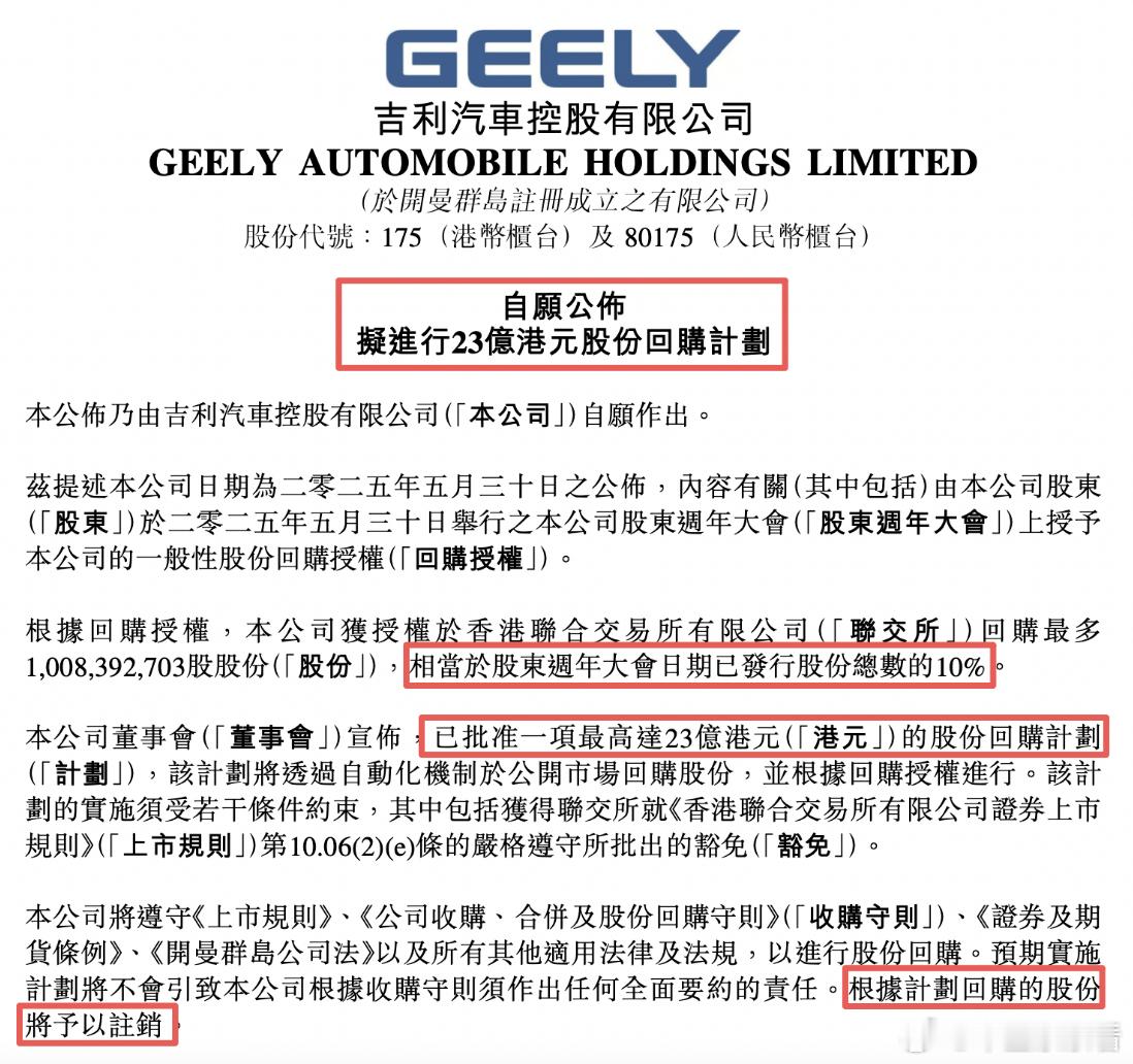 通过回购并注销股份,不仅有助于提升每股收益、增强股东回报,也反映出吉利汽车对业务基本面和未来增长潜力的积极预期,充分展现了公司全球竞争力的持续强化与对长期稳健发展的坚定信心。