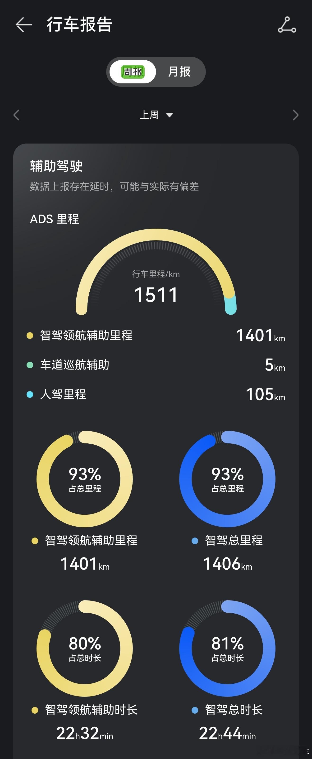 给大家汇报一下我的问界M8自驾游,上周开了1511公里,智驾辅助占比高达93%,够不够高?欢迎大家晒晒图[不愧是你]要不是有些地方想自己开开,占比99%都不成问题。其中出游第一天就八百多公里,超过10个小时,要是没有华为ADS,那真不一定开得下来[喵喵]