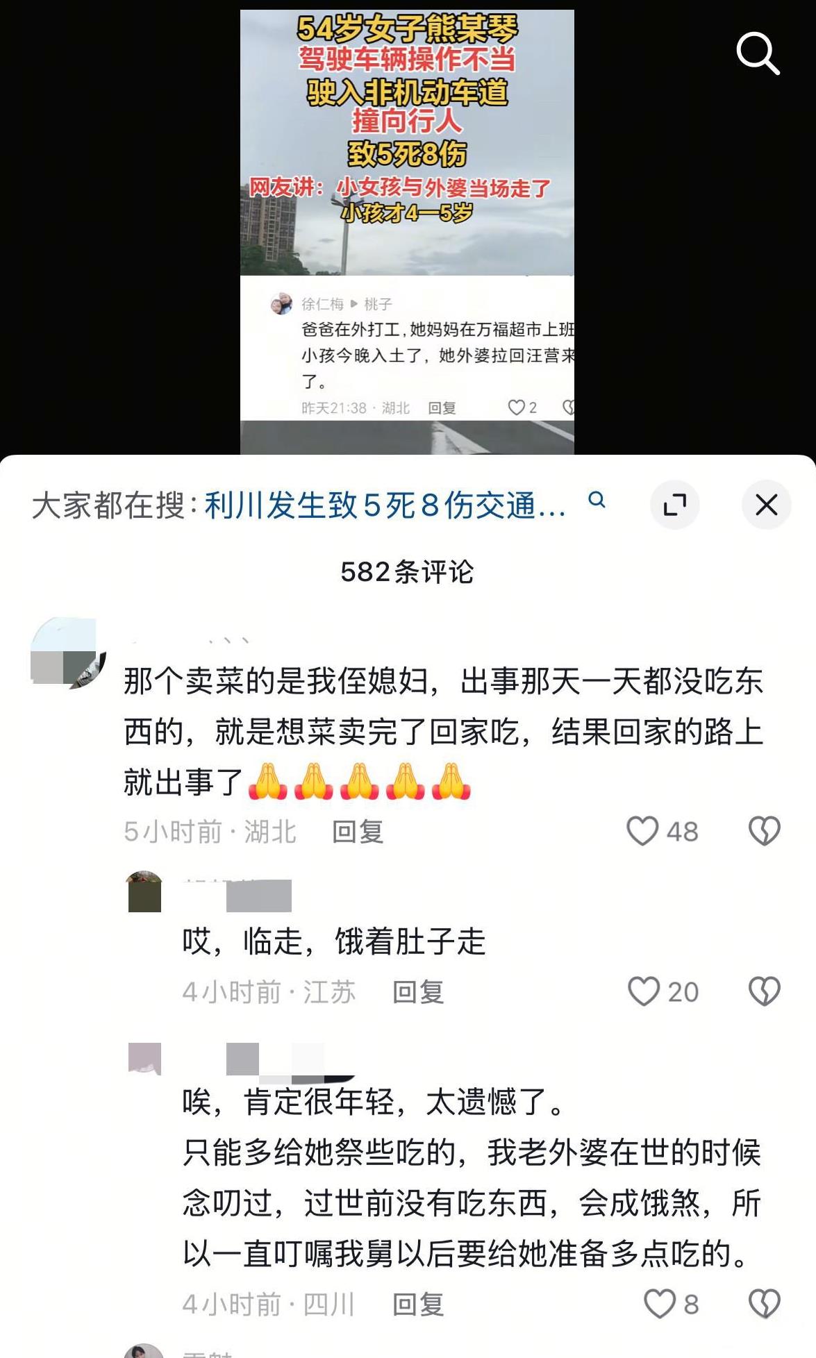 5死8伤这起车祸中最让我心疼的是一个卖菜的女子,她饿了一天,想把菜卖完再回家吃饭。[可怜]没想到,她此生再也没有机会吃一顿饱饭了。 她的亲属发声透露:这位女子平常是靠种地卖菜为生的,无论是酷暑还是寒冬,她大多数时间都在外面经营着这项小本买卖。按道理来说,手里赚的钱,买个外卖还是富余的,然而,她早已经习惯了节俭。 事发当天,从早上离家开始到下午五点多,她都没舍得给自己在外面买一碗饭吃。她一心想着,等菜卖完了再回家吃饭。 下午五点多,她刚收完摊子走在回家的路上。不料,54岁的熊某就驾驶着小车冲撞了过来。由于车子速度太快,被撞人群都来不及做出反应,人就被撞倒了。 5个遇难者中,她就是其中的一个。更让人难受的是,[流泪]那天,她饿了好几个小时,只盼着回家能吃碗热乎的饭菜,然而,这么简单的心愿最终却不幸落空了! 她年纪轻轻就没了生命,连一顿饱饭都没有来得及吃,这一点,于她的家人来说,是莫大的遗憾与痛楚啊![流泪][祈祷][祈祷][祈祷]