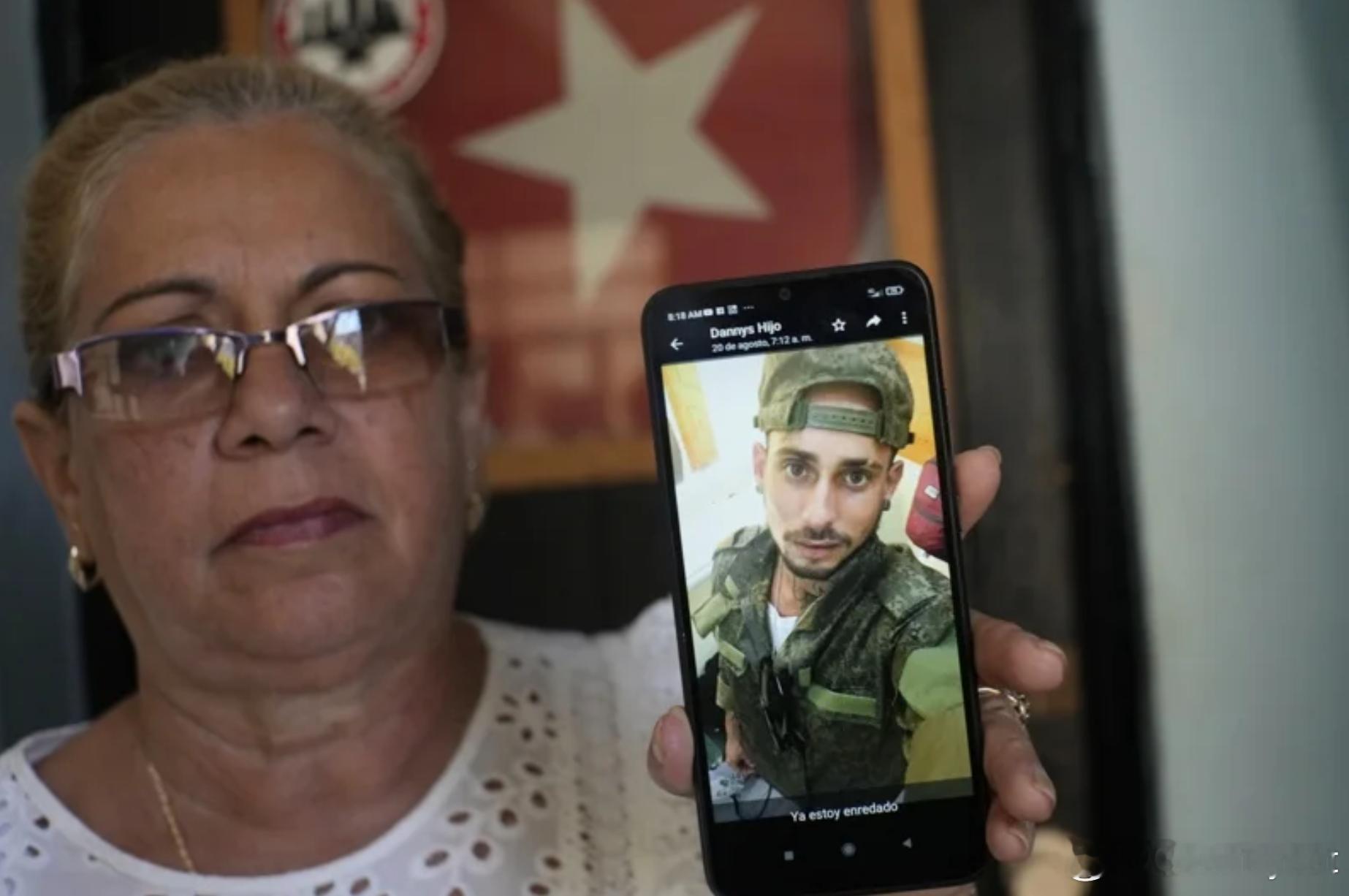 图:家住古巴哈瓦那的妇女维奈特手持手机照片,影中人是穿着迷彩军装的儿子。她说儿子本是被聘去俄罗斯做建筑工程,但没想到被送到乌克兰战场打仗。 (美联社)