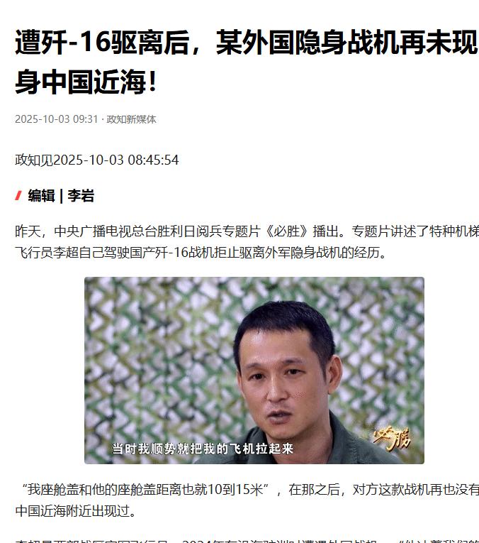 振奋人心!歼16一战锤爆2架美军F-35隐身战机,彻底撕毁美隐身战机神话。 事情的开端毫无征兆。李超和战友正按计划执行任务,外军的隐身战机突然出现在空域。对方的意图极其明确,就是冲着领海线方向来挑衅。 李超没有丝毫迟疑,驾驶歼-16立刻迎了上去。现代空战的胜负往往在毫秒间分晓,他凭借歼-16搭载的有源相控阵雷达,第一时间就捕捉到了目标信号。 锁定的提示音在座舱内响起,第一架外军隐身战机瞬间暴露在瞄准光环里。这一下彻底打了对方个措手不及,对方僚机见状立刻大速度脱离空域。 但剩下的那架战机并不甘心。它非但没有撤离,反而强行扭转机身,反过来锁定了李超驾驶的歼-16,试图用战术压制挽回局面。 紧接着,更惊险的一幕出现了。对方似乎觉得单架对抗不占优势,又调来了另一架同型隐身战机增援。两架隐身战机形成掎角之势,试图在空域内对歼-16形成包围。 这时候的李超展现出了顶尖飞行员的心理素质和战术素养。他没有被动防御,反而猛地拉杆操纵战机攀升。 歼-16双引擎爆发出强劲推力,瞬间完成一个漂亮的桶滚动作,直接绕到了对方长机的头顶。 这一刻,空中态势彻底逆转。李超的座舱盖和对方的座舱盖距离仅有10到15米,几乎到了能看清对方飞行员表情的程度。 倒飞状态下的歼-16火力系统丝毫不受影响,机载雷达同时锁定了这两架来犯的隐身战机。 电子屏上的锁定信号持续闪烁,两枚霹雳-15空空导弹处于待发状态。面对这样密不透风的压制,两架外军战机终于放弃了抵抗。 它们在慌乱中调整航向,最终灰溜溜地撤离了这片空域。这场惊心动魄的空中较量,以歼-16的完胜告终。 最解气的是后续。专题片明确透露,这是这款外军隐身战机唯一一次出现在中国近海。 经此一役后,它们再也没敢靠近这片空域。曾经被西方吹上天的“隐身不可探测”神话,在东海的蓝天之下彻底破灭。 这可不是偶然的胜利,背后是歼-16硬实力的支撑。作为我国自主研发的四代半重型战机,歼-16的航电系统堪称顶级配置。 它搭载的有源相控阵雷达天线尺寸更大,配合双引擎带来的持续供电优势,探测范围和抗干扰能力都处于世界前列。这也是它能精准捕捉隐身目标的关键。 很多人以前总觉得,四代半战机面对五代隐身战机只能被动挨打。但李超的实战经历彻底打破了这种偏见。 歼-16不仅能靠雷达硬“抓”住隐身目标,更能凭借12个武器挂点搭载的霹雳-15、霹雳-10导弹组合,形成远中近三层火力网。 这次对抗中,李超的战术选择更是精准拿捏了双方的优劣。他没有陷入远距离纠缠,而是用桶滚动作快速抢占高度优势,将空战拉到近距离缠斗的维度。 这一下正好击中了对方隐身战机的软肋——为了追求隐身性能,其近距离机动性反而不如歼-16这类重型战机灵活。 要知道,美国一直把F-35的隐身性能当作核心威慑力,宣称其能“悄无声息突破任何防空网”。但这次东海交锋彻底撕下了这块遮羞布。 歼-16用实打实的战绩证明,隐身并非不可战胜,先进航电配合精准战术,完全能让所谓的“神话”现形。 这已经不是中国战机第一次在近海展现实力。此前美军EP-3侦察机抵近侦察时,中国歼-10战机就曾依法依规进行拦截,用专业操作逼退外机。 但这次不同,对抗的对象是号称“全球最先进”的隐身战机,而且是一打二的局面。李超的胜利,既是个人能力的体现,更是国产战机性能的最好背书。 有人可能会问,歼-16作为四代半战机,凭什么能对抗五代机?答案藏在细节里。 歼-16的雷达不仅能探测远距离目标,更能在复杂电磁环境下稳定工作。它搭载的涡扇-10发动机提供的强劲动力,让其能完成桶滚、倒飞等大过载动作。 这些优势叠加在一起,再配上飞行员的精湛技艺,就构成了对抗隐身战机的完整体系。 这场空中较量的意义远超一次简单的驱离。它向外界传递了一个清晰信号:中国的防空识别区不是虚设的,任何来犯的战机,无论披着什么样的“隐身外衣”,都逃不过中国空军的眼睛。 曾经,西方在航空领域的技术优势让不少人产生了“代差焦虑”。但从歼-20列装到歼-16实战建功,中国空军用十几年时间完成了跨越式发展。 李超在接受采访时的语气很平静,但每一个字都透着底气。他说做完动作时,座舱盖之间的距离近到能清晰对视。 这短短十几米的距离,浓缩的是中国空军从追赶到超越的艰辛历程。那些被西方垄断的技术壁垒,正在被一个个打破。 更值得称道的是,这次胜利不是靠运气。专题片透露,飞行员们在执行任务前,会细致研究对手的能力极限,反复打磨协同战术。 正是这种“料敌于先”的准备,才让李超在实战中能应对自如。所谓的“神话”,本质上都是没被戳破的假象。 信源:中央广播电视总台胜利日阅兵专题片《必胜》相关报道(政知新媒体,2025年10月3日)