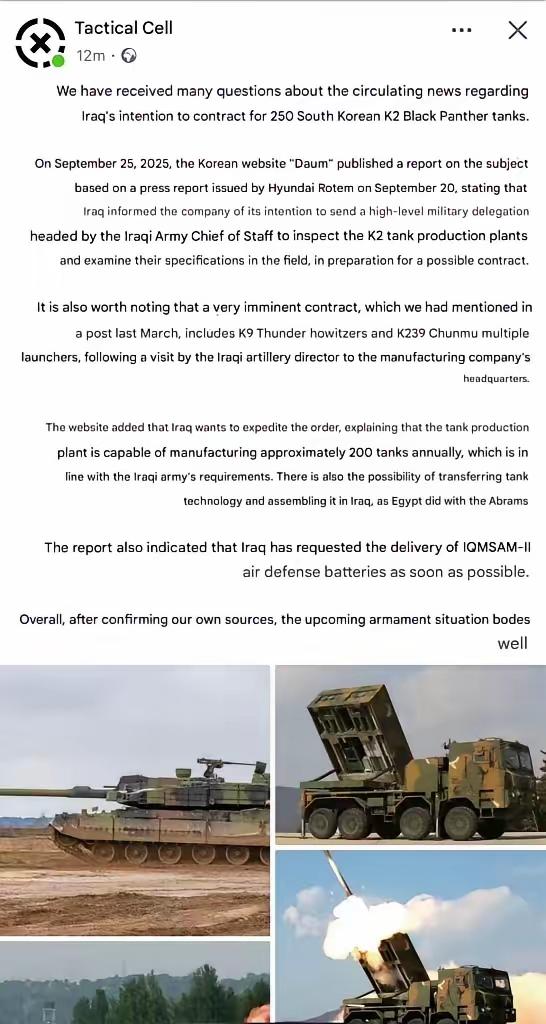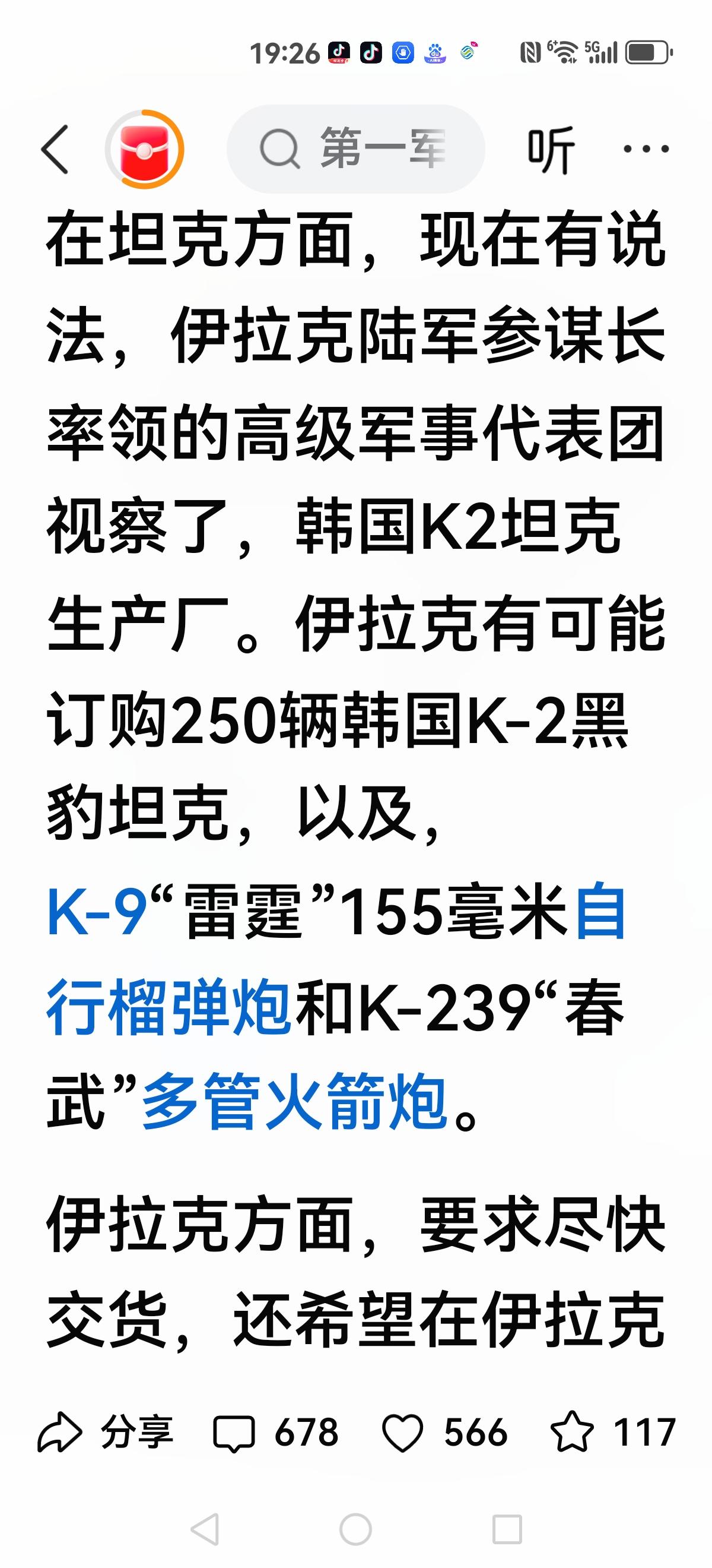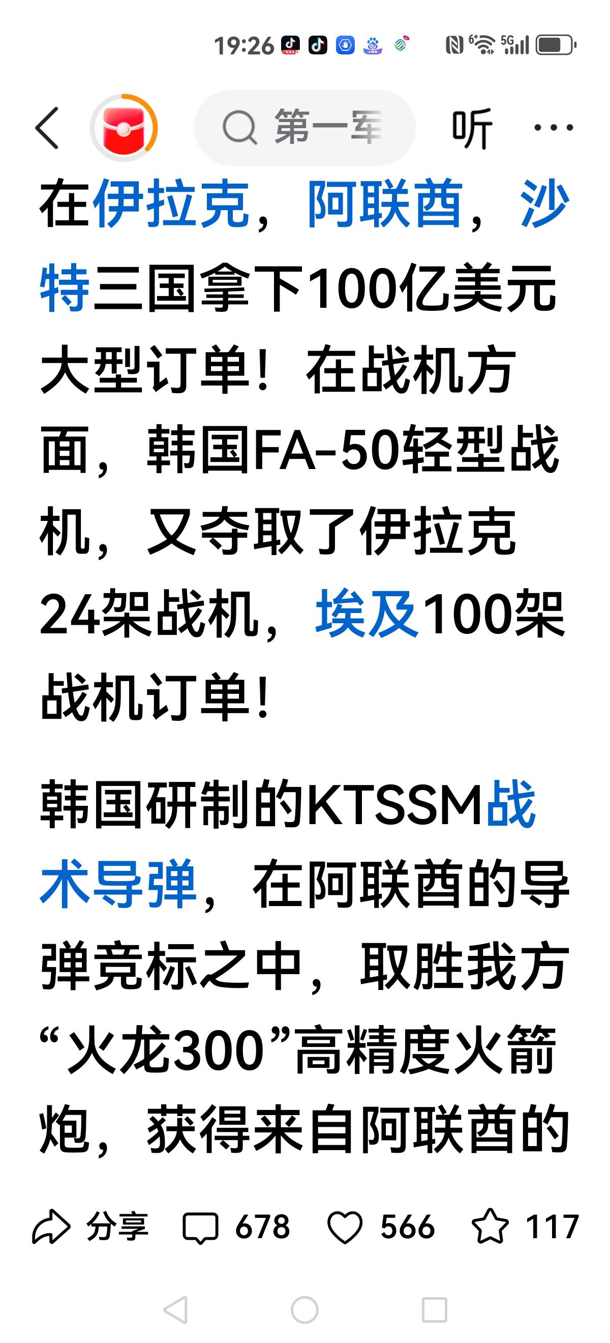 【面对现实,清醒认知,清场式遥遥领先轻易不要乱说】 韩国在伊拉克,阿联酋,沙特三国拿下100亿美元大型订单! 战机:韩国FA-50轻型战机,被伊拉克采购24架战机,埃及100架战机订单! 导弹:韩国的KTSSM战术导弹,在阿联酋取胜我方“火龙300”高精度火箭炮,获得来自阿联酋的订单。 坦克:伊拉克陆军参谋长采购团,最终采购韩国K2坦克生产厂的250辆K-2黑豹坦克。 张维为,金灿荣,沈逸,高志凯等等应该沉住气,不要口无遮拦,真正的较量是实打实的订单与品质。