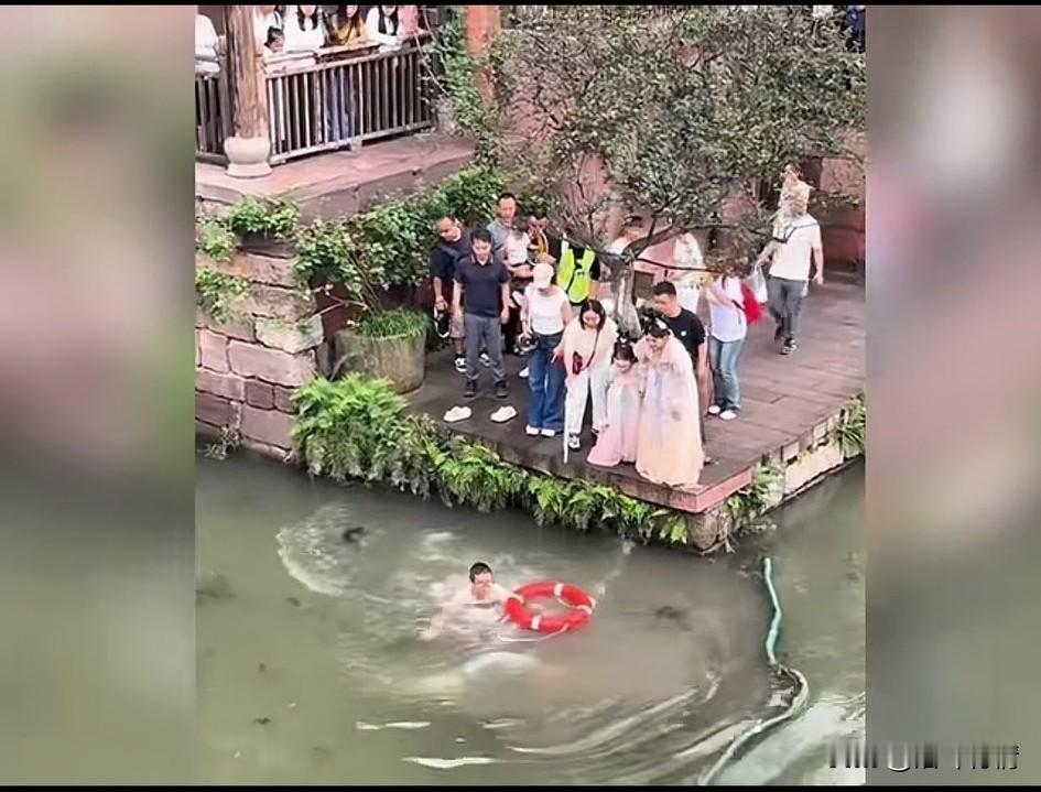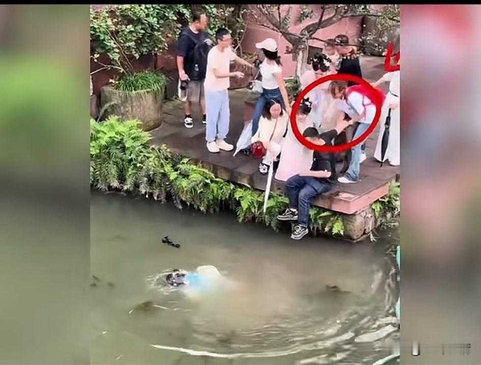 李庄古镇女子穿古装拍照不幸落水, 这让四川宜宾的李庄古镇彻底火了, 周围游客倒是不少, 只是大家都不会游泳, 干着急只能大喊大叫, 落水女子也是着急了, 在水中挣扎扑腾, 眼看就要不行了, 旁边的黑衣服小哥忍不住了, 脱了外套就准备跳下去, 他身后的女友及时拉住了她, 劝它冷静不要上头, 最后硬是被女友拉了回去, 看没有人救援, 又一个白衣男子, 不顾安危跳下了水, 虽然有女子用棍子试图救援, 奈何棍子太短了够不着, 有着急的游客扔去了游泳圈, 游泳圈直接砸中女子头部, 然后女子就不扑腾了, 可能是被砸晕了, 头已经沉入水中, 幸亏白衣男子跳下了水, 水挺深的直接淹到了他的脖子, 白衣男子鼓足勇气走向了她, 从水中托起女子, 女子这才转危为安, 这时古镇的安全员才匆忙赶回来, 刚才应该是去找长棍子了, 还是会游泳最靠谱, 有时候泳泳圈也不一定能救命, 景区安全员也不一定靠谱, 大家对于黑衣男子被女友用力拉回怎么看? 宜宾资讯 遇到落水者你会跳下去救人吗你不会游泳会跳水里营救落水者吗? 李庄风景名胜区 李庄文旅