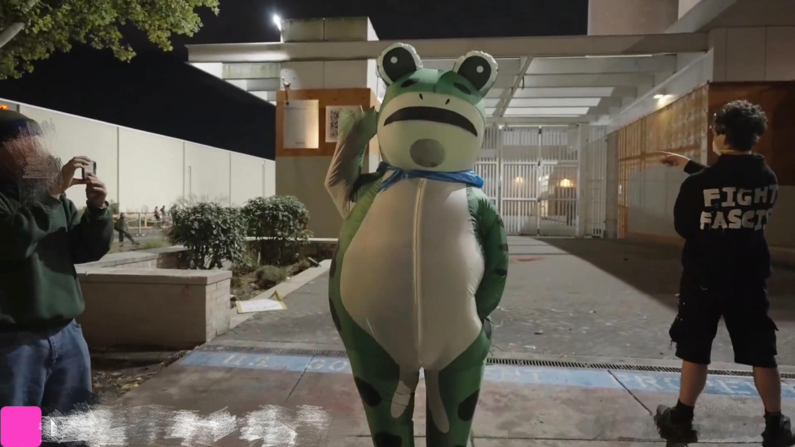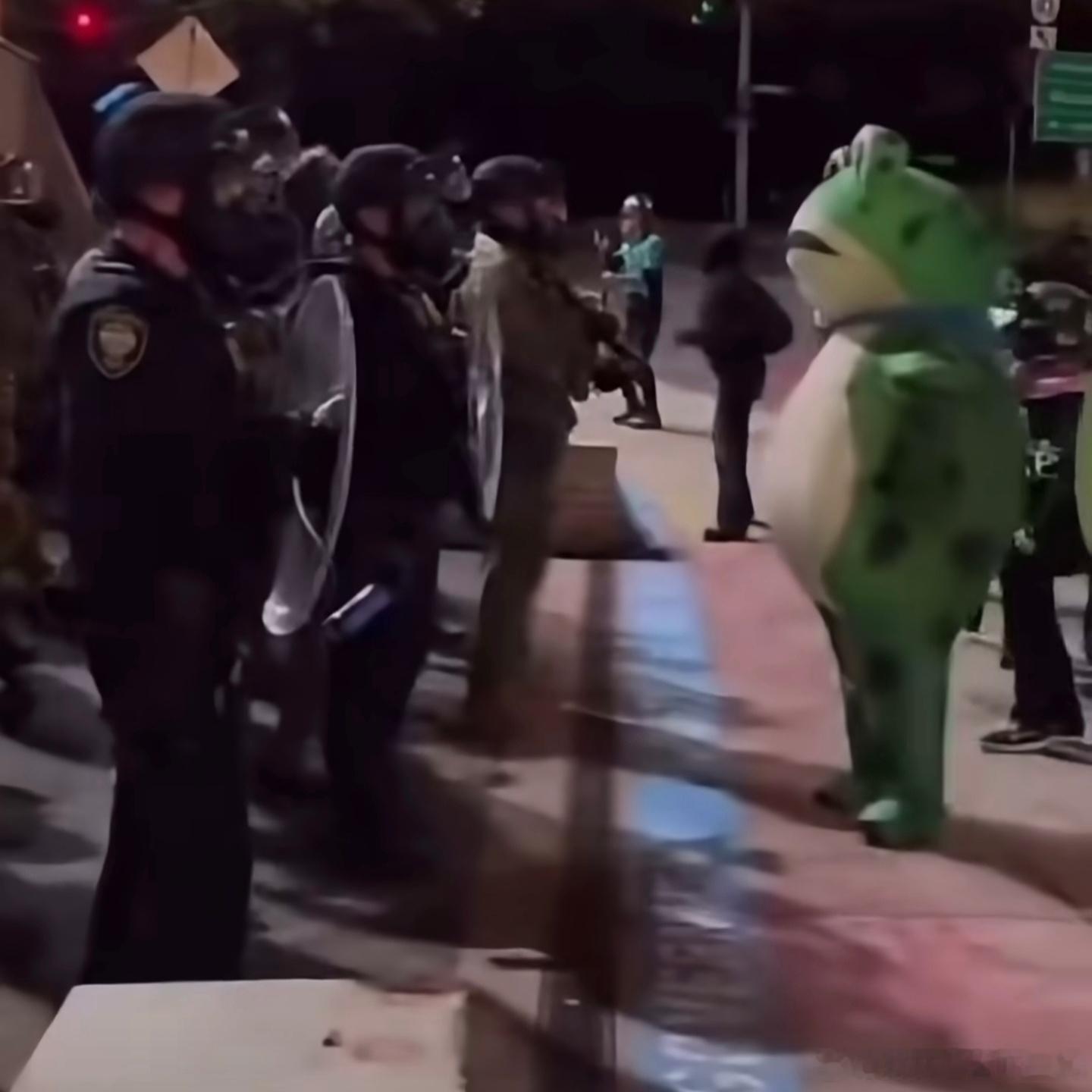 说一个非常抽象的文化输出事件,九月底伴随着美国俄勒冈州波特兰市即将部署国民警卫队的消息越传越凶,当地社区立即掀起了十分激烈的示威运动。这些示威者在十月初完成聚集直接堵住了位于波特兰城市南部的ICE(美国移民及海关执法局)总部,要求ICE立即停止针对外来移民的拘留与驱逐。接下来离谱的场面就出现了,美国波特兰示威现场竟惊现一只曾在中国红遍大街小巷的“卖崽青蛙”,记得前两年我小区门口就有人穿这套行头向路人兜售气球!