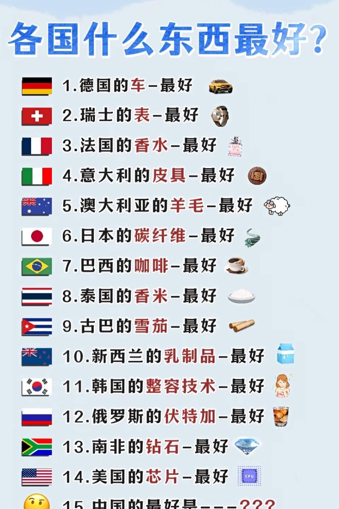 各国什么东西最好?你都知道吗? 1、德国的车--最好 2、瑞士的表--最好 3、法国的香水--最好 4、意大利的皮具--最好 5、日本的电子数码产品--最好 6、澳大利亚的羊毛--最好 7、巴西的咖啡--最好 8、泰国的香米--最好 9、韩国的整容技术--最好 10、新西兰的乳制品--最好 11、古巴的雪茄--最好 12、俄罗斯的伏特加--最好 13、南非的钻石--最好 14、美国的芯片--最好 15、中国的最好是--???
