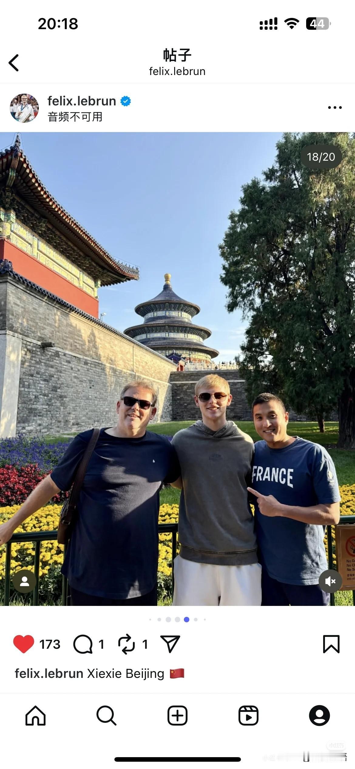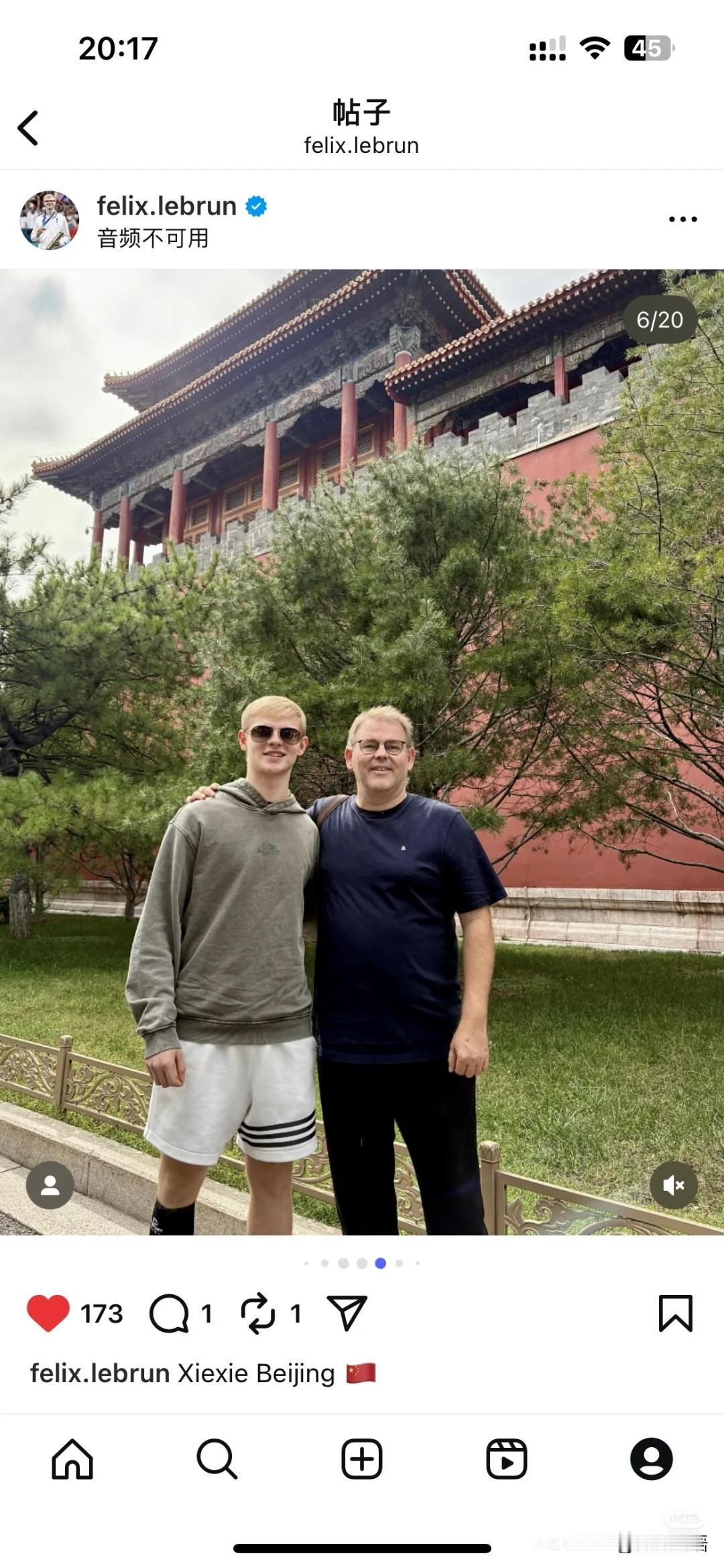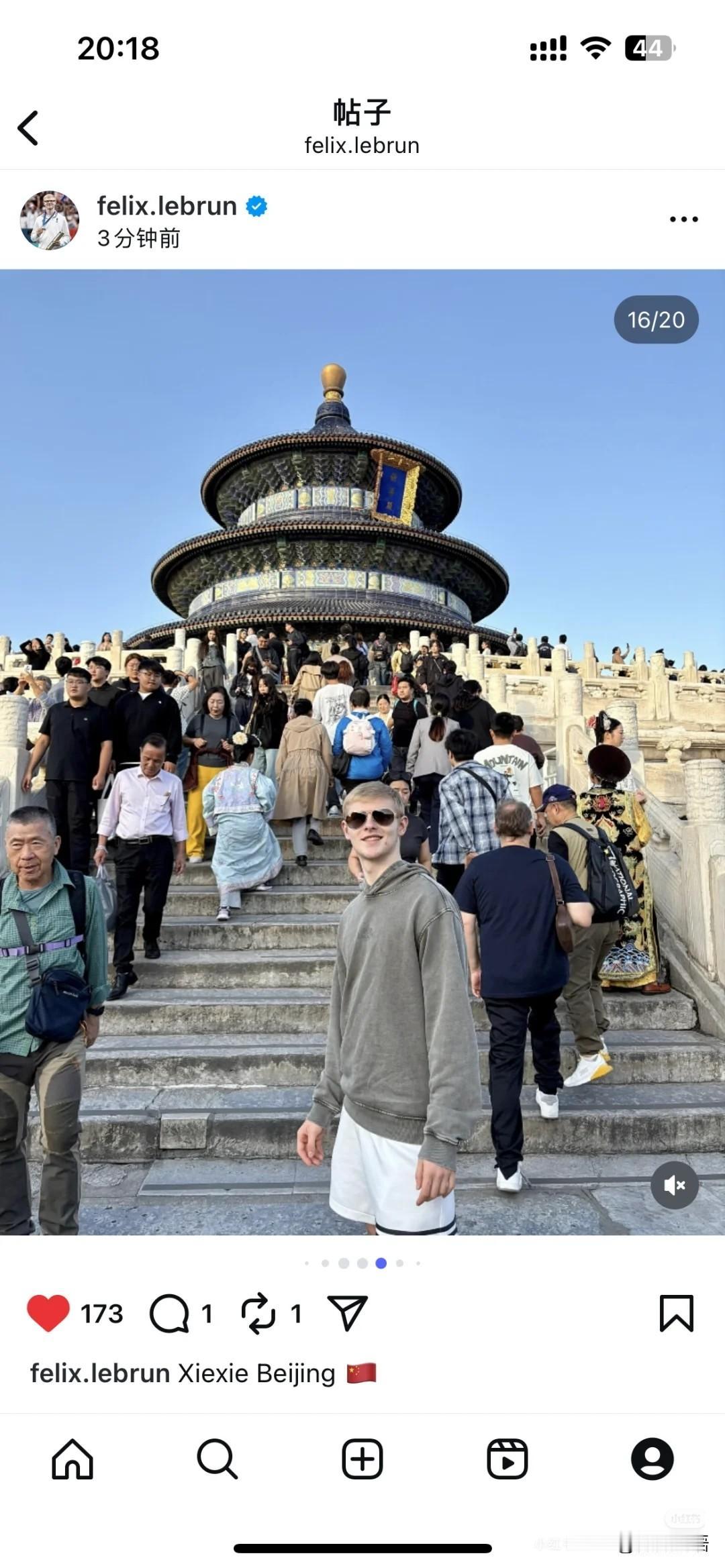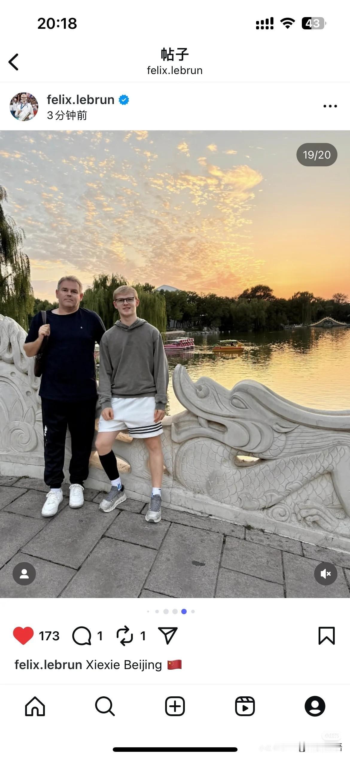 菲利克斯•勒布伦还没离开北京呢。 看得出来,小布这次拿了单打亚军,真的很开心。昨天比赛结束后,小布没有着急回法国,今天他带着爸爸和队医一起去看北京的天坛公园和故宫,小布一直穿着球迷送给他的这件卫衣,这样看小布也挺帅气的。这也是拿着球拍看世界,比赛结束,在北京旅行,也挺好的。 现在的小布真的沉稳了很多,比赛的时候没有以前那么急躁,球品也不错。现在还在假期,看到在故宫也有很多人,还有球迷在天坛公园偶遇小布,小布也跟他们合影了,这次北京之旅小布收获也很多。 刚刚看到小布发了动态,他说:“谢谢北京 ,我在那里的时光非常愉快,人们很友善,氛围很棒,粉丝也很出 色!明年再见!现在要为下周在扎达尔举行的欧洲锦标赛做准备了!很快再见 。”愉快的北京之旅结束了,小布也要回去备战欧锦赛了。