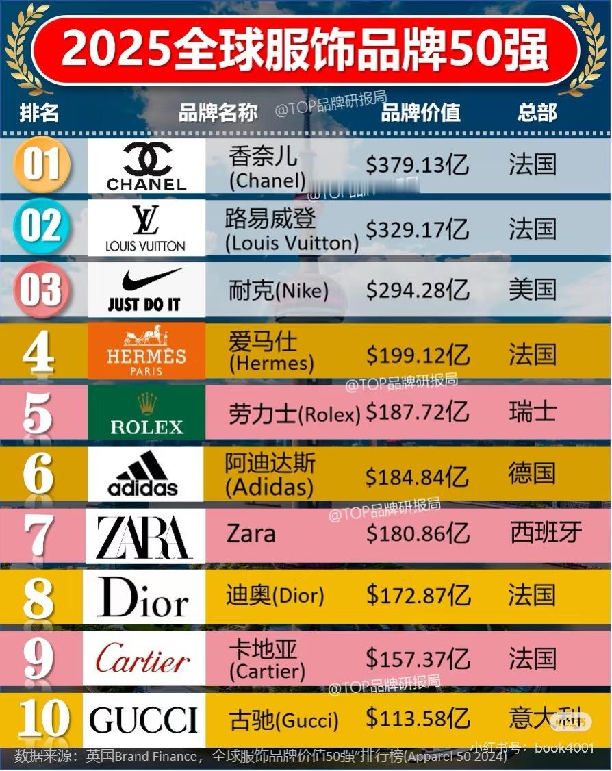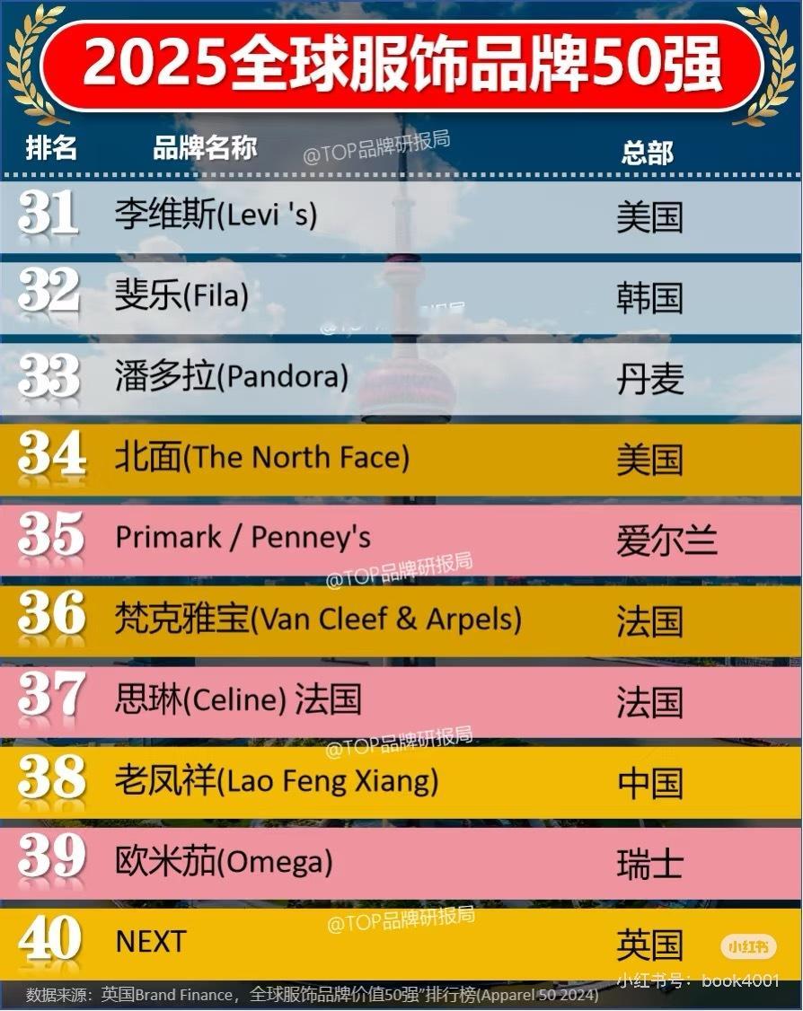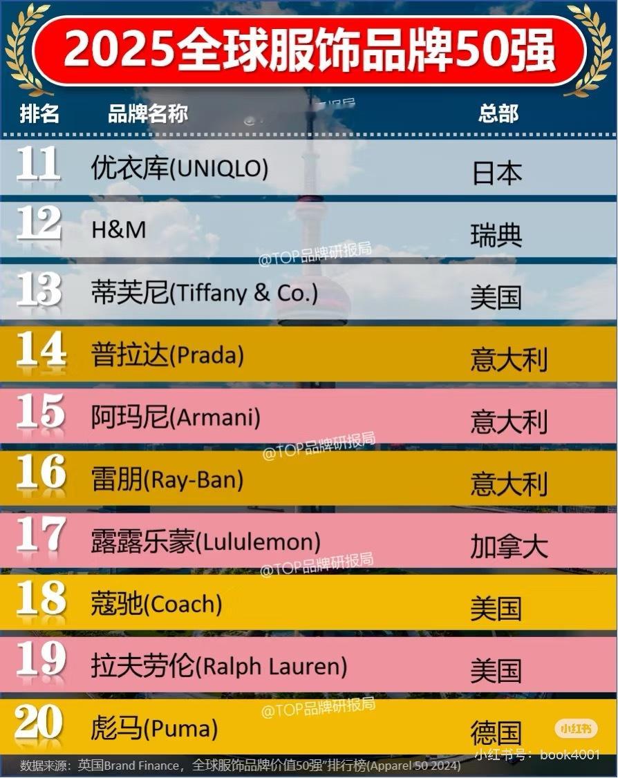 2025全球服饰品牌价值50强英国品牌评估机构“品牌金融”(BrandFina